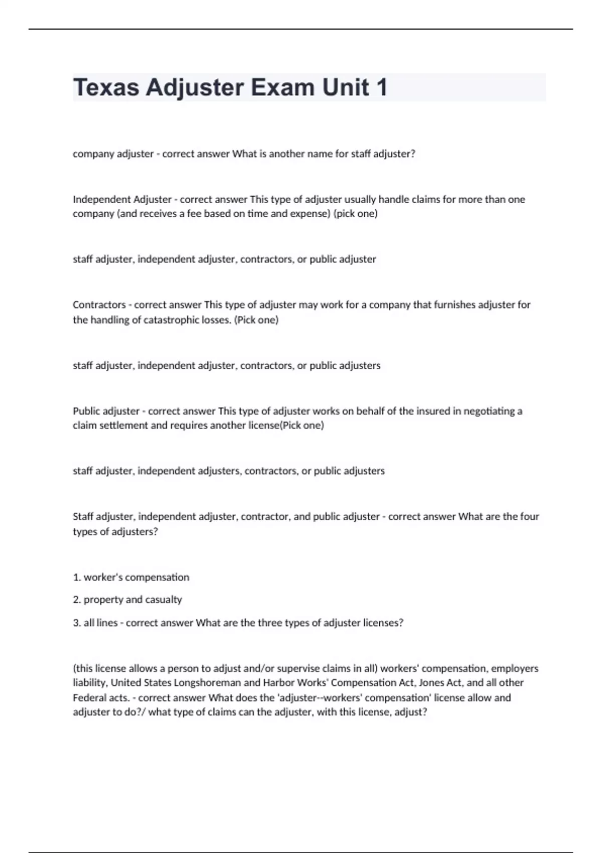 Texas Adjuster Exam Unit 1company adjuster - correct answer What is another name for staff adjuster? Independent Adjuster - correct answer This type of adjuster usually handle claims for more than one company (and receives a fee based on time and expense) (pick one) staff adjuster, independent adjuster, contractors, or public adjuster Contractors - correct answer This type of adjuster may work for a company that furnishes adjuster for the handling of catastrophic losses. (Pick one) staff adjuster, independent adjuster, contractors, or public adjusters Public adjuster - correct answer This type of adjuster works on behalf of the insured in negotiating a claim settlement and requires another license(Pick one) staff adjuster, independent adjusters, contractors, or public adjusters Staff adjuster, independent adjuster, contractor, and public adjuster - correct answer What are the four types of adjusters? 1. worker's compensation 2. property and casualty 3. all lines - correct answer What are the three types of adjuster licenses? (this license allows a person to adjust and/or supervise claims in all) workers' compensation, employers liability, United States Longshoreman and Harbor Works' Compensation Act, Jones Act, and all other Federal acts. - correct answer What does the 'adjuster--workers' compensation' license allow and adjuster to do?/ what type of claims can the adjuster, with this license, adjust?