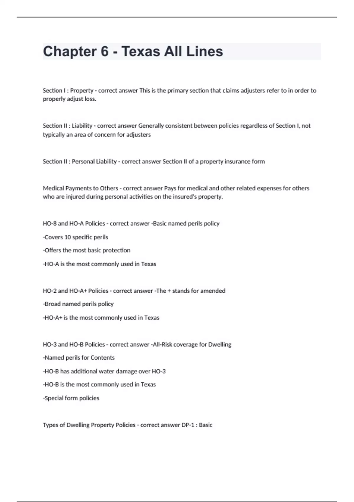 SF: Texas All Lines Adjuster; Pre-licensing Practice Exam 2024 passed
