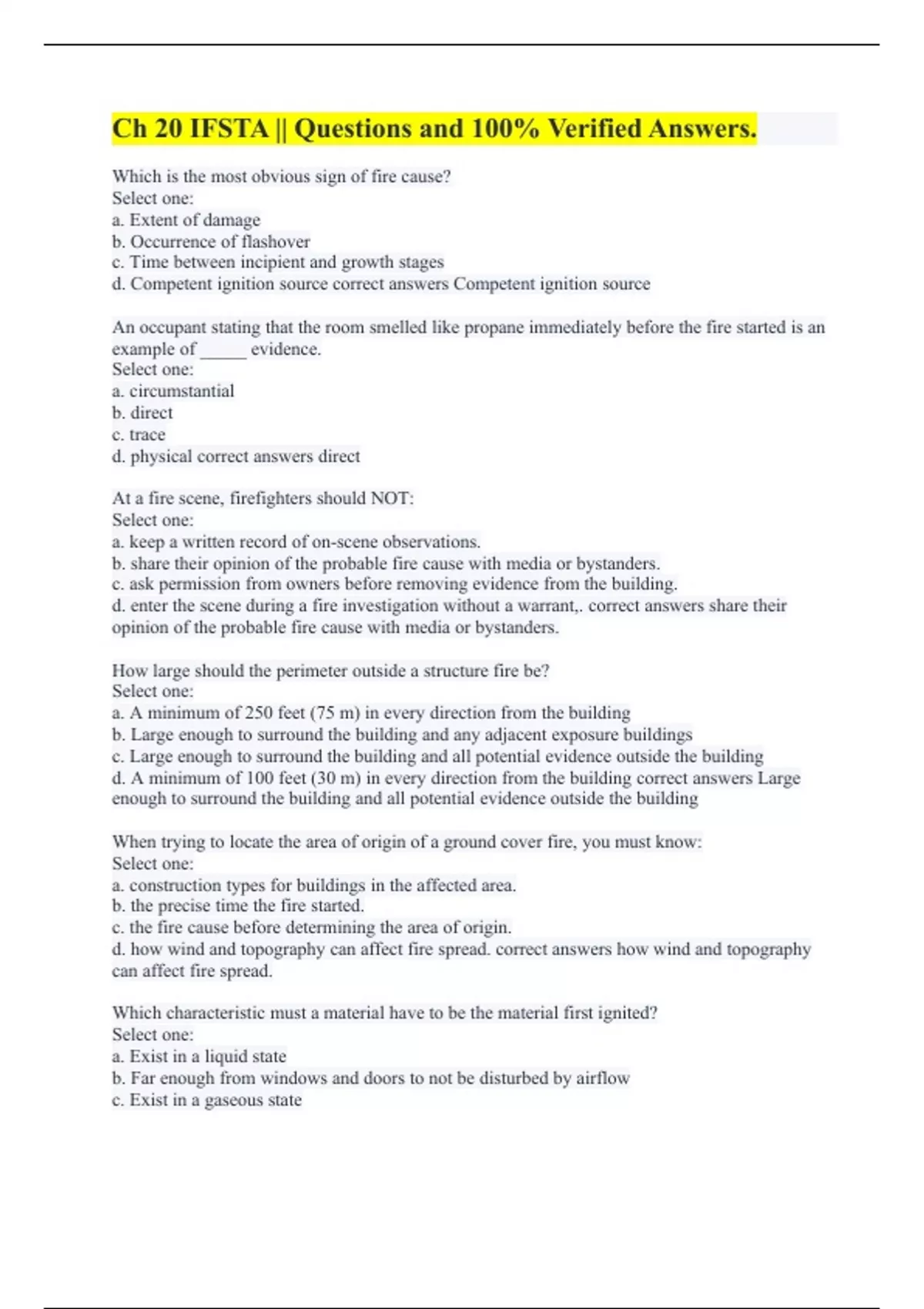 Which is the most obvious sign of fire cause? Select one: a. Extent of damage b. Occurrence of flashover c. Time between incipient and growth stages d. Competent ignition source correct answers Competent ignition source An occupant stating that the room smelled like propane immediately before the fire started is an example of _____ evidence. Select one: a. circumstantial b. direct c. trace d. physical correct answers direct At a fire scene, firefighters should NOT: Select one: a. keep a written record of on-scene observations. b. share their opinion of the probable fire cause with media or bystanders. c. ask permission from owners before removing evidence from the building. d. enter the scene during a fire investigation without a warrant,. correct answers share their opinion of the probable fire cause with media or bystanders. How large should the perimeter outside a structure fire be? Select one: a. A minimum of 250 feet (75 m) in every direction from the building b. Large enough to surround the building and any adjacent exposure buildings c. Large enough to surround the building and all potential evidence outside the building d. A minimum of 100 feet (30 m) in every direction from the building correct answers Large enough to surround the building and all potential evidence outside the building When trying to locate the area of origin of a ground cover fire, you must know: Select one: a. construction types for buildings in the affected area. b. the precise time the fire started. c. the fire cause before determining the area of origin. d. how wind and topography can affect fire spread. correct answers how wind and topography can affect fire spread. Which characteristic must a material have to be the material first ignited? Select one: a. Exist in a liquid state b. Far enough from windows and doors to not be disturbed by airflow c. Exist in a gaseous state