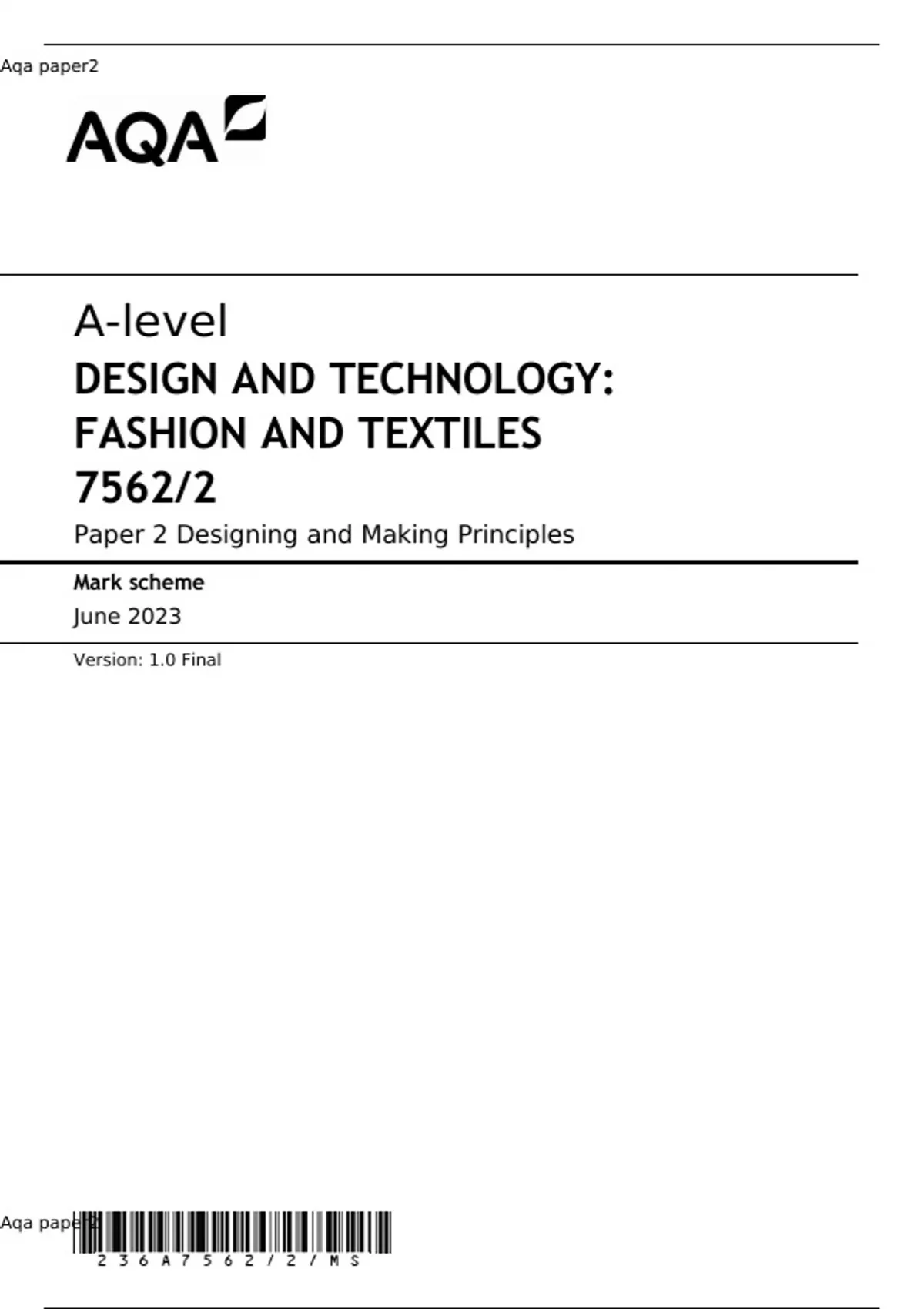 , MARK SCHEME – A-LEVEL DESIGN AND TECHNOLOGY: FASHION AND TEXTILES – 7562/2 –