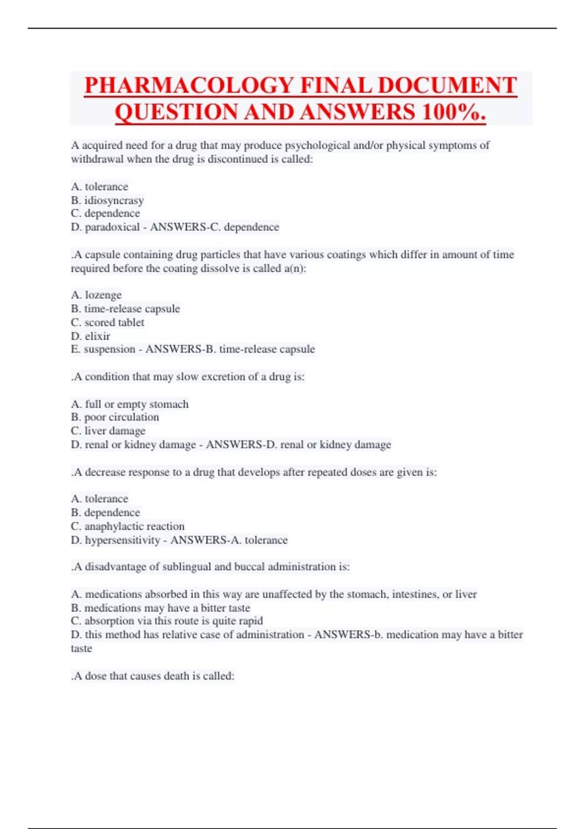 A acquired need for a drug that may produce psychological and/or physical symptoms of withdrawal when the drug is discontinued is called: A. tolerance B. idiosyncrasy C. dependence D. paradoxical - ANSWERS-C. dependence .A capsule containing drug particles that have various coatings which differ in amount of time required before the coating dissolve is called a(n): A. lozenge B. time-release capsule C. scored tablet D. elixir E. suspension - ANSWERS-B. time-release capsule .A condition that may slow excretion of a drug is: A. full or empty stomach B. poor circulation C. liver damage D. renal or kidney damage - ANSWERS-D. renal or kidney damage .A decrease response to a drug that develops after repeated doses are given is: A. tolerance B. dependence C. anaphylactic reaction D. hypersensitivity - ANSWERS-A. tolerance .A disadvantage of sublingual and buccal administration is: A. medications absorbed in this way are unaffected by the stomach, intestines, or liver B. medications may have a bitter taste C. absorption via this route is quite rapid D. this method has relative case of administration - ANSWERS-b. medication may have a bitter taste .A dose that causes death is called: A. maximum dose B. toxic dose C. lethal dose D. loading dose - ANSWERS-C. lethal dose .A drug agent that promotes bowel evacuation is a(n): A. enteric B. exlax C. parenteral D. laxative - ANSWERS-D. laxative .A drug suspended in a substance that melts at body temperature is a(n): A. dermal patch B. eye ointment C. vaginal cream D. suppository - ANSWERS-D. suppository .A gastric tube is used for medication delivery: A. in patients able to tolerate oral medications B. in patients who are unable to take anything by mouth for an extended period of time C. in patients who are nauseated D. all of the above - ANSWERS-B. in patients who are unable to take anything by mouth for an extended period of time .A glass container sealed at the top by a rubber stopper is called a(n): A. medicine cup B. ampule C. vial D. pill crusher - ANSWERS-C. vial .A larger number gauge for a needle indicates a _______ size. A. longer needle B. shorter needle C. larger lumen D. smaller lumen - ANSWERS-D. smaller lumen .A liquid form of medication that must be shaken well before administration is called a(n): A. lozenge B. time-release capsule C. scored tablet D. elixir E. suspension - ANSWERS-E. suspension .A list of possible unpleasant or dangerous secondary effects, other than the desired effect is: A. adverse reactions and side effects B.. actions and classifications C. cautions and contraindications D. interactions and contraindications - ANSWERS-A. adverse reactions and side effects .A medication error may include: A. administration of the wrong drug B. administration of the right drug at the wrong time C. improper documentation in the patients record D. any of the above - ANSWERS-D. any of the above .A method of medication delivery where it is absorbed through the skin via time-released patch is: A. suspension B. subcutaneous C. transdermal D. intradermal - ANSWERS-C. transdermal .A preparation for external use that is rubbed on the skin as a counterirritant is called a: A. cream or ointment B. lotion C. liniment D. dermal patch - ANSWERS-C. liniment .A severe, possibly fatal, allergic response is called: A. tolerance B. dependence C. anaphylactic reaction D. hypersensitivity - ANSWERS-C. anaphylactic reaction .A small glass container that must be broken at the neck to obtain the solution is called a(n): A. medicine cup B. ampule C. vial D. pill crusher - ANSWERS-B. ampule .A substance used to induce emesis is a(n): A. poison B. antidote C. ingestion D. emetic - ANSWERS-D. Emetic .A tablet that is absorbed in the mouth between the cheek and gum is called a(n): A. solution B. enteric-coated tablet C. buccal tablet D. syrup E. sublingual tablet - ANSWERS-C. buccal tablet .A tablet with a special coating that resists disintegration by gastric juices is called a(n): A. solution B. enteric-coated tablet C. buccal tablet D. syrup E. sublingual tablet - ANSWERS-B. enteric-coated tablet .A unique, unusual response to a drug in a given patient is called: A. tolerance B. idiosyncrasy C. dependence D. paradoxical - ANSWERS-B. isiodyncrasy .Activated charcoal is given to: A. cause emesis B. minimize systemic absorption of the injected poison C. prevent emesis D. maximize systemic absorption of the ingested poison - ANSWERS-B. minimize systemic of the ingested poison .Air can cause what reaction during the administration of negative contrast agents? - ANSWERS-emboli .All phone orders must be: A. taken by a physician B. read back for accuracy C. recorded by an LVN D. have no special requirements - ANSWERS-B. read back for accuracy .Amount of a drug that will produce harmful side effects or symptoms of poisoning is called: A. maximum dose B. toxic dose C. lethal dose D. loading dose - ANSWERS-B. toxic dose .An injection delivered just beneath the skin is: - ANSWERS-intradermal .An injection that is given to a patient relies on a(n) _______ route of administration. A. enteral B. parenteral C. topical D. portal - ANSWERS-B. parenteral .An orphan drug is defined as a(n): A. drug used only in children B. drugs used to treat a disease that affects only a small number of people C. lone drug in specific class of drugs D. unapproved drug used to treat a rare disease - ANSWERS-B. drug used to treat a disease that affects only a small number of people .Anion - ANSWERS-have a negative charge .Antimatter - ANSWERS-a positron .Any characteristic that makes a drug undesirable or improper is its: A. risk to benefit factor B. tolerance C. solubility D. contraindications - ANSWERS-D. contraindications .Aspiration is best defined as: - ANSWERS-unintentional inhalation of a substance that may result in damage or infection .Barium has an atomic number of - ANSWERS-56 .Barium Peritonitis - ANSWERS-inflammation of the abdominal cavity .Being delivered by injection directly into