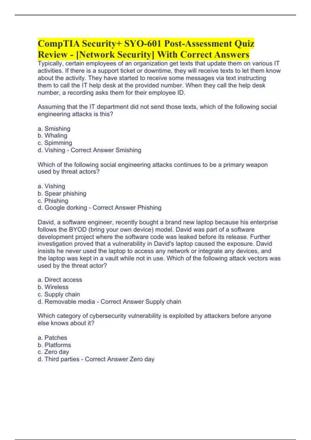 Typically, certain employees of an organization get texts that update them on various IT activities. If there is a support ticket or downtime, they will receive texts to let them know about the activity. They have started to receive some messages via text instructing them to call the IT help desk at the provided number. When they call the help desk number, a recording asks them for their employee ID. Assuming that the IT department did not send those texts, which of the following social engineering attacks is this? a. Smishing b. Whaling c. Spimming d. Vishing - Correct Answer Smishing Which of the following social engineering attacks continues to be a primary weapon used by threat actors? a. Vishing b. Spear phishing c. Phishing d. Google dorking - Correct Answer Phishing David, a software engineer, recently bought a brand new laptop because his enterprise follows the BYOD (bring your own device) model. David was part of a software development project where the software code was leaked before its release. Further investigation proved that a vulnerability in David's laptop caused the exposure. David insists he never used the laptop to access any network or integrate any devices, and the laptop was kept in a vault while not in use. Which of the following attack vectors was used by the threat actor? a. Direct access b. Wireless c. Supply chain d. Removable media - Correct Answer Supply chain Which category of cybersecurity vulnerability is exploited by attackers before anyone else knows about it? a. Patches b. Platforms c. Zero day d. Third parties - Correct Answer Zero day