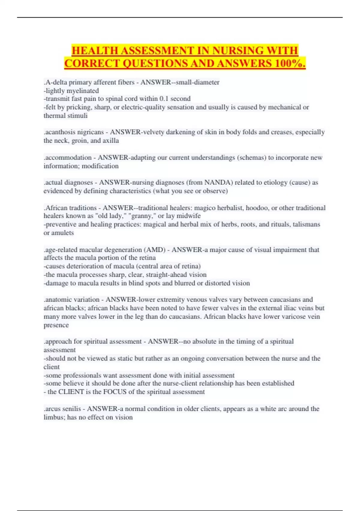 .A-delta primary afferent fibers - ANSWER--small-diameter -lightly myelinated -transmit fast pain to spinal cord within 0.1 second -felt by pricking, sharp, or electric-quality sensation and usually is caused by mechanical or thermal stimuli .acanthosis nigricans - ANSWER-velvety darkening of skin in body folds and creases, especially the neck, groin, and axilla .accommodation - ANSWER-adapting our current understandings (schemas) to incorporate new information; modification .actual diagnoses - ANSWER-nursing diagnoses (from NANDA) related to etiology (cause) as evidenced by defining characteristics (what you see or observe) .African traditions - ANSWER--traditional healers: magico herbalist, hoodoo, or other traditional healers known as "old lady," "granny," or lay midwife -preventive and healing practices: magical and herbal mix of herbs, roots, and rituals, talismans or amulets .age-related macular degeneration (AMD) - ANSWER-a major cause of visual impairment that affects the macula portion of the retina -causes deterioration of macula (central area of retina) -the macula processes sharp, clear, straight-ahead vision -damage to macula results in blind spots and blurred or distorted vision .anatomic variation - ANSWER-lower extremity venous valves vary between caucasians and african blacks; african blacks have been noted to have fewer valves in the external iliac veins but many more valves lower in the leg than do caucasians. African blacks have lower varicose vein presence .approach for spiritual assessment - ANSWER--no absolute in the timing of a spiritual assessment -should not be viewed as static but rather as an ongoing conversation between the nurse and the client -some professionals want assessment done with initial assessment -some believe it should be done after the nurse-client relationship has been established - the CLIENT is the FOCUS of the spiritual assessment .arcus senilis - ANSWER-a normal condition in older clients, appears as a white arc around the limbus; has no effect on vision .Asian traditions - ANSWER--healers: chinese medical practitioners, herbalists -preventive and healing practices: prevent or rebalance yin/yang, hot/cold foods and conditions, wear amulets, acupuncture, cupping, moxibustion .assimilation - ANSWER-interpreting one's new experience in terms of one's existing schemas .assimilation with culture - ANSWER-the gradual adoption and incorporation of characteristics of the prevailing culture .auscultation - ANSWER-the sounds detected using auscultation are classified according to intensity (loud or soft), pitch (high or low), duration (length), and quality(musical, crackling, raspy) of sound .axillary temp - ANSWER-35.4-37.0C 95.6-98.5F .barriers from deceased donors (blood products, transfusions, and organ donation): - ANSWER--lack of awareness of transplantation -religious or cultural distrust of the medical community -fear of medical abandonment (if donating) -fear of racism .barriers from living donors (blood products, transfusions, and organ donation): - ANSWER--unwillingness to donate -medical comorbid conditions -distrust or fear of medical community -loss to follow-up (return for follow-up) -poor coping mechanisms -financial concerns -reluctance to ask family members and friends -fear of surgery -lack of awareness about living donor kidney transplantation .bell of stethoscope - ANSWER-used to detect low-pitched sounds .benefits of spiritual care to the client: - ANSWER--support for healthy grieving -support for improved self-esteem and confidence -assistance with maximization of potential in the current circumstances -support to improve relationships with self, others, and with an absolute/God -assistance in renewing a sense of meaning and hope -enhancement of the client's sense of belonging -assistance in improving problem solving -help with enduring problems that cannot be solved and with continuing distress and disability -help in finding renewed hope .binocular vision - ANSWER-"two-eyed" vision .blunt percussion - ANSWER-used to detect tenderness over organs .BMI - ANSWER- .body mass index - ANSWER-see page 233 .C-fibers - ANSWER--unmyelinated -primary afferent fibers -transmit slow pain within 1 second -felt as burning, throbbing, or aching -caused by mechanical, thermal, or chemical stimuli -resulting in tissue damage .cardiac output - ANSWER-the more blood the heart pumps, the greater the pressure in the blood vessels; ex. BP increases during exercise .cataracts - ANSWER--leading cause of blindness -preventable -clouding of the lens of the eye; vision affected more at night .Changes in BP and recommendations for follow-up - ANSWER-normal 120-129/80-84= prehypertension- recheck 2yrs borderline 130-139/85-89= prehypertension- recheck 1 yr Hypertension >140/90= hypertension -stage 1: 140-159/90-99= stage 1- confirm within 2 months -stage 2: 160-179/100-109= stage 2- eval or refer to source of care within 1 month -stage 3: >180/110= stage 2- eval and treat immed. within 1 week .characteristics of religion - ANSWER--formal -organized -group oriented -ritualistic -objective, easily measurable .characteristics of spiritual assessment - ANSWER--formal or informal -respectful -nonbiased .characteristics of spiritual care - ANSWER--individualistic -client oriented -collaborative .characteristics of spirituality - ANSWER--informal -nonorganized -self-reflective -may involve spirtual experiences -subjective, difficult to measure .cholesterol - ANSWER-important to normal bodily functions; necessary component of bile salts that aid in digestion .circulating blood volume - ANSWER-an increase in the volume will increase BP. A sudden drop in BP may indicate a sudden blood loss, as with internal bleeding; orthostatic BP is when the patient stands up and BP changes .closed-ended questions - ANSWER-To obtain facts and to focus on specific info; keep interview on course; clarify or obtain more accurate info; .coining in Asian culture - ANSWER- .COLDSPA - A
