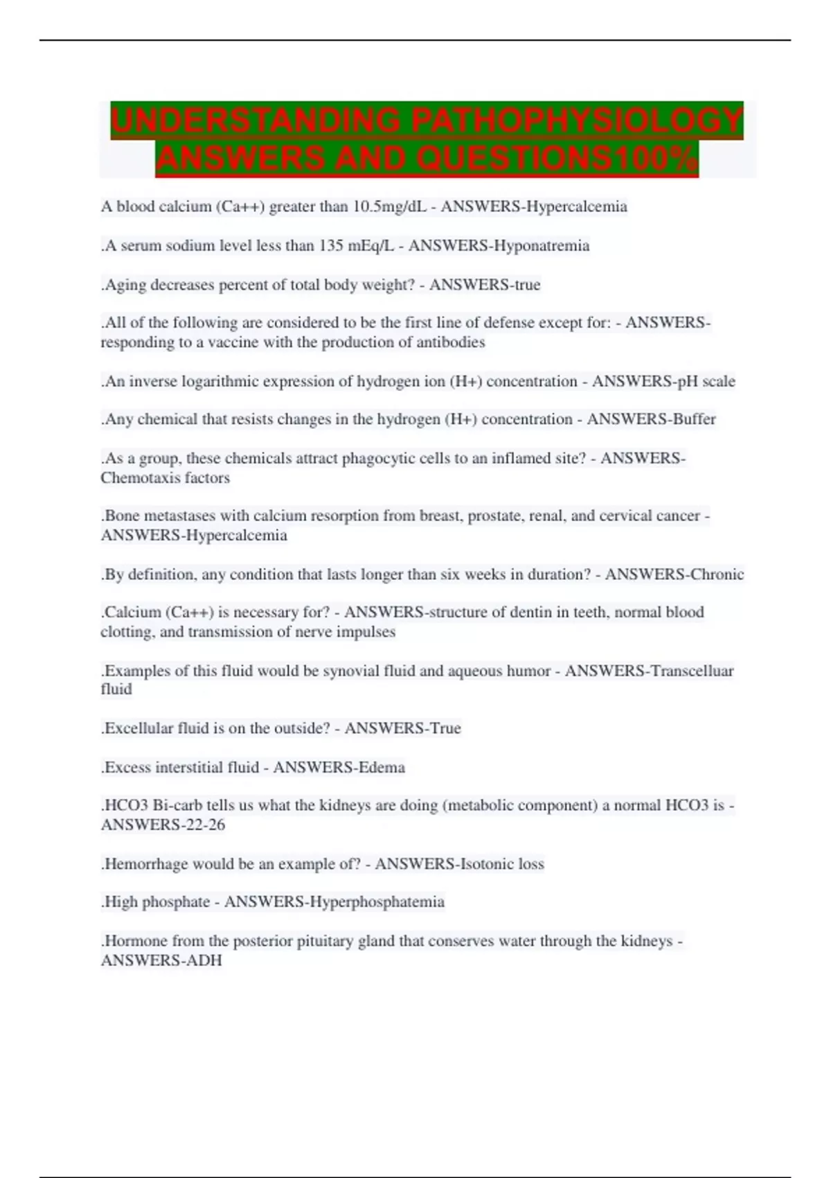 A blood calcium (Ca++) greater than 10.5mg/dL - ANSWERS-Hypercalcemia .A serum sodium level less than 135 mEq/L - ANSWERS-Hyponatremia .Aging decreases percent of total body weight? - ANSWERS-true .All of the following are considered to be the first line of defense except for: - ANSWERS-responding to a vaccine with the production of antibodies .An inverse logarithmic expression of hydrogen ion (H+) concentration - ANSWERS-pH scale .Any chemical that resists changes in the hydrogen (H+) concentration - ANSWERS-Buffer .As a group, these chemicals attract phagocytic cells to an inflamed site? - ANSWERS-Chemotaxis factors .Bone metastases with calcium resorption from breast, prostate, renal, and cervical cancer - ANSWERS-Hypercalcemia .By definition, any condition that lasts longer than six weeks in duration? - ANSWERS-Chronic .Calcium (Ca++) is necessary for? - ANSWERS-structure of dentin in teeth, normal blood clotting, and transmission of nerve impulses .Examples of this fluid would be synovial fluid and aqueous humor - ANSWERS-Transcelluar fluid .Excellular fluid is on the outside? - ANSWERS-True .Excess interstitial fluid - ANSWERS-Edema .HCO3 Bi-carb tells us what the kidneys are doing (metabolic component) a normal HCO3 is - ANSWERS-22-26 .Hemorrhage would be an example of? - ANSWERS-Isotonic loss .High phosphate - ANSWERS-Hyperphosphatemia .Hormone from the posterior pituitary gland that conserves water through the kidneys - ANSWERS-ADH .If the amount of bicarbonate ion (HCO3) decreases: - ANSWERS-hydrogen ion (H+) will increase .In which compartment is most of the body water found? - ANSWERS-Intracellular fluid .Inadequate intestinal absorption, deposition of ionized calcium into bone or soft tissue, blood administration - ANSWERS-Hypocalcemia .Infants have less total body water than do adults? - ANSWERS-False .Intracellular fluid is on the inside and amounts to what % of fluid - ANSWERS-65% .Low phosphate - ANSWERS-Hypophosphatemia .Macroscopic signs of inflammation include: - ANSWERS-erythema (redness), pain, and loss of function .Necessary for high energy bonds located in creatine phosphate and ATP and acts as an anion buffer - ANSWERS-Phosphate .Oxygen pO2 is oxygen dissolved in the blood a normal pO2 is - ANSWERS-80-100 but preferred 02 is 90-100 .pCO2 tells us about the respiratory component a normal CO2 is - ANSWERS-35-45 .Pediatrics total body weight is - ANSWERS-75%-80% .Potassium balance is described by changes in plasma potassium levels - ANSWERS-Hypokalemia .Regulates intracellular electrical neutrality in relation to Na+ and H+ - ANSWERS-Potassium .The _____ releases and synthesized numerous inflammatory mediators upon injury? - ANSWERS-Mast cell .The immediate response of blood vessels to injury? - ANSWERS-Vasoconstriction .The normal blood pH range is? - ANSWERS-7.35-7.45 .The primary extracellular anion - ANSWERS-Chloride .The primary Extracellular fluid anion? - ANSWERS-Chloride .The primary Extracellular fluid cation? - ANSWERS-sodium .The primary intracellular cation is? - ANSWERS-Potassium