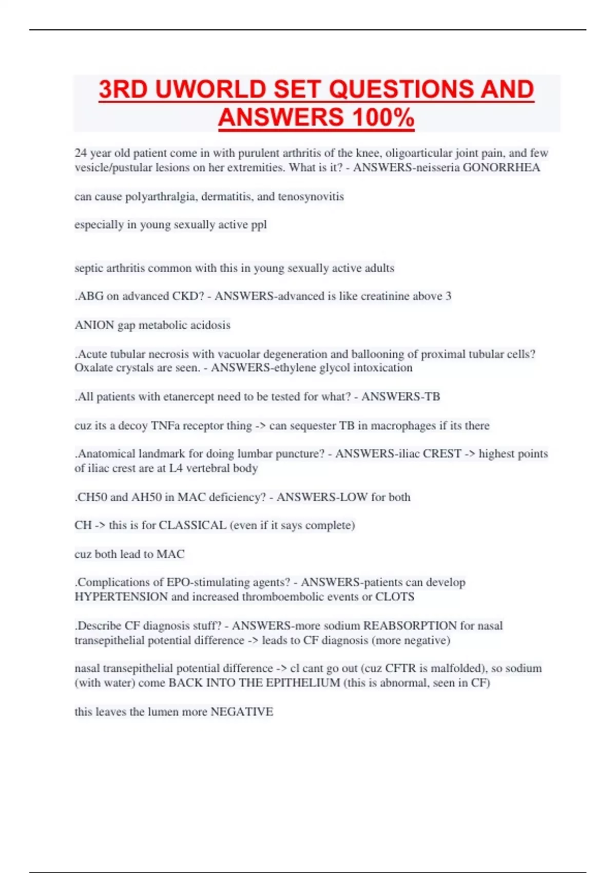 24 year old patient come in with purulent arthritis of the knee, oligoarticular joint pain, and few vesicle/pustular lesions on her extremities. What is it? - ANSWERS-neisseria GONORRHEA can cause polyarthralgia, dermatitis, and tenosynovitis especially in young sexually active ppl septic arthritis common with this in young sexually active adults .ABG on advanced CKD? - ANSWERS-advanced is like creatinine above 3 ANION gap metabolic acidosis .Acute tubular necrosis with vacuolar degeneration and ballooning of proximal tubular cells? Oxalate crystals are seen. - ANSWERS-ethylene glycol intoxication .All patients with etanercept need to be tested for what? - ANSWERS-TB cuz its a decoy TNFa receptor thing -> can sequester TB in macrophages if its there .Anatomical landmark for doing lumbar puncture? - ANSWERS-iliac CREST -> highest points of iliac crest are at L4 vertebral body .CH50 and AH50 in MAC deficiency? - ANSWERS-LOW for both CH -> this is for CLASSICAL (even if it says complete) cuz both lead to MAC .Complications of EPO-stimulating agents? - ANSWERS-patients can develop HYPERTENSION and increased thromboembolic events or CLOTS .Describe CF diagnosis stuff? - ANSWERS-more sodium REABSORPTION for nasal transepithelial potential difference -> leads to CF diagnosis (more negative) nasal transepithelial potential difference -> cl cant go out (cuz CFTR is malfolded), so sodium (with water) come BACK INTO THE EPITHELIUM (this is abnormal, seen in CF) this leaves the lumen more NEGATIVE in skin -> CFTR is reversed. It absorbs Cl. So can't absorb, NaCl builds up and can be detected on sweat .Dude has hypoglycemia, but no symptoms of hypoglycemia except hes hungry. What happened? - ANSWERS-a non-selective Beta blocker like propanolol was used remember, in low glucose -> NE/E is ramped up (this is what causes tachy, tremors, anxiety/aroual) and B-blockers will block this still hungry due to ACh effects -> ACh causes the sweating, hunger, and paresthesias (due to muscle activate) .Early after an MI, where does the pericarditis occur? - ANSWERS-its called peri-infarction pericarditis -> 2-4 days after just develops overlying the necrotic myocardial segment dressler's is diffuse autoimmune attack of the entire pericardium (weeks to months after an MI) .Histology of HSP? - ANSWERS-perivascular neutrophilic inflammation small vessels with FIBRINOID NECROSIS leukocytoclastic vasculitis (nuclear debris) this disease presents with palpable purpura, ARTHRALGIAS (JOINT PAIN), and KIDNEY involvement .How can rhabdo effect the kidney? - ANSWERS-causes ATN!!!!! the heme pigement injuries the kidneys -> ATN .How do class 1a antiaryhtmics work and what are they? - ANSWERS-block sodium channel (some can block K too -> prolong AP) these are procainamaide, quinidine .How do class 1b antiarryhtmics work and what are they? - ANSWERS-LIDOCAINE block sodium channel .How do class 1c antiarrythmics work and what are they? - ANSWERS-block sodium channel flecainide .How do class 3 antiaryythrmics work and what are they? - ANSWERS-they block POTASSIUM channel outflow these are like AMIODARONE, sotafol, dofetilide .How do interferon a and b work in stopping virus? - ANSWERS-they HALT protein synthesis only in the presence of DOUBLE-STRANDED RNA (which is typical of viruses, so normal cells are chillin) also induce MHC1 -> so NK and CD8 can kill .How does adenosine affect cardiac AP? - ANSWERS-activates POTASSIUM channel conductance -> increases potassium outflow AV node delay .How does azathioprine effect B and T cell levels? - ANSWERS-drops BOTH side effect is pancytopenia .How does etanercept work? - ANSWERS-"cept" basically acts as a decoy receptor -> binds to Fc of IgG, sucking TNFa to the decoy receptor and preventing normal TNFa action .How does Wilson's disease present? - ANSWERS-accumulation of COPPER -> low serum CERULOPLASMIN in young ppl, LIVER and NEURO/PSYCH symptoms diagnose with SLIT lamp (on eye) for Kayser-Fleischer rings .How fast does loss of cardiomyocyte contractility occur with total ischemia? - ANSWERS-literally 60 seconds or a MINUTE after 30 minutes -> injury is irreversible .How motile is pseudomonas? - ANSWERS-its hella MOTILE .How to calculate CO? - ANSWERS-Ficks rate of O2 CONSUMPTION/arteriovenous O2 content DIFF .How to know biologics mechanism? - ANSWERS-"mab" -> monoclonal antibody ""cept" -> receptor molecule decoy thing "nib" is a KINASE inhibitor (like tyrosine for example) .How to treat BPH? - ANSWERS-Finasteride!!!! or prazosin tamsulosin .How to treat drug-induced parkinsonism? - ANSWERS-benztropine ("tropine" like atropine) like due to haloperidol give BENZTROPINE -> antimuscarinic (it says "tropine" like atropine) .If during pregnancy, posterior vagina is lacerated, what is torn? - ANSWERS-PERINEAL BODY .Impaired MAC formation leads to susceptible to what? - ANSWERS-its ENCAPSULATED bacterias in general but yeah N meningitidis comes up a lot, but can also see pneumonia due to to strep .Intermittent muscle spams triggered by sensory stimuli? - ANSWERS-TETANUS .Just foodborne illness and person gets better? How? - ANSWERS-staph aureus -> dude just ate the heat-stable enterotoxin itself (preformed toxin) mayonnaise-based chicken salads, dairy products, anything its the performed toxin tho .Major HIP flexors? - ANSWERS-rectus femoris, iliopsoas, and SARTORIUS (just think cross-legged position for its functions) .Most common heart thing in woman after giving birth? - ANSWERS-DILATED cardiomyopathy -> reduced EF .needle-like cholesterol clefts? - ANSWERS-this is atheroembolic event, most likely after a coronary surg like cardiac angiography -> dislodges it KIDNEY INJURY IS COMMON .Nice big yellow/gray ball tumor thing seen in the endometrium? well circumscribed - ANSWERS-it is a FIBROID leiomyoma .Once invading lamina propria of enterocytes, describe diff in typhi vs salmonella enteriditis? - ANSWERS-enteriditis -> gets phagocytosed by neutrophils and macrophages -> hella inflammation