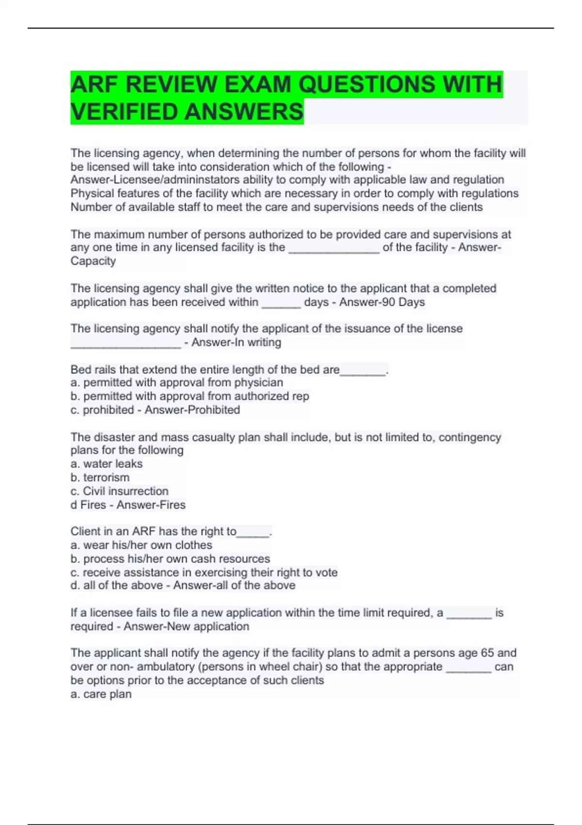 ARF REVIEW EXAM QUESTIONS WITH VERIFIED ANSWERS if the application for an initial license is denied, the application process dee shall _______ a. be refunded b. be refunded, after 10% penalty c. be forfeited - Answer-be forfeited a denial or revocation of license may occur under the following a. failure to pay civil penalties b. yearly evaluation visit shows employees without fingerprint clearance ca deficiency not corrected - Answer-failure to pay civil penalties the fee for a capacity of 1-6 for renewal or original licensee is $100. a. True b. False - Answer-False An adult is a person who is 21 years of age or older. a. True b. False - Answer-False the licensing agency shall not be permitted to decrease an existing license capacity. a. true b. false - Answer-false all facilities must post a license in a conspicuous place a. true b. false - Answer-false disaster drills shall be conducted at least every 3 months and maintained for one year a. true b. false - Answer-false