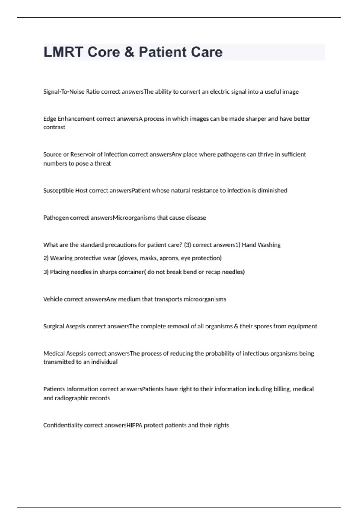 Signal-To-Noise Ratio correct answersThe ability to convert an electric signal into a useful image Edge Enhancement correct answersA process in which images can be made sharper and have better contrast Source or Reservoir of Infection correct answersAny place where pathogens can thrive in sufficient numbers to pose a threat Susceptible Host correct answersPatient whose natural resistance to infection is diminished Pathogen correct answersMicroorganisms that cause disease What are the standard precautions for patient care? (3) correct answers1) Hand Washing 2) Wearing protective wear (gloves, masks, aprons, eye protection) 3) Placing needles in sharps container( do not break bend or recap needles) Vehicle correct answersAny medium that transports microorganisms Surgical Asepsis correct answersThe complete removal of all organisms & their spores from equipment Medical Asepsis correct answersThe process of reducing the probability of infectious organisms being transmitted to an individual Patients Information correct answersPatients have right to their information including billing, medical and radiographic records Confidentiality correct answersHIPPA protect patients and their rights