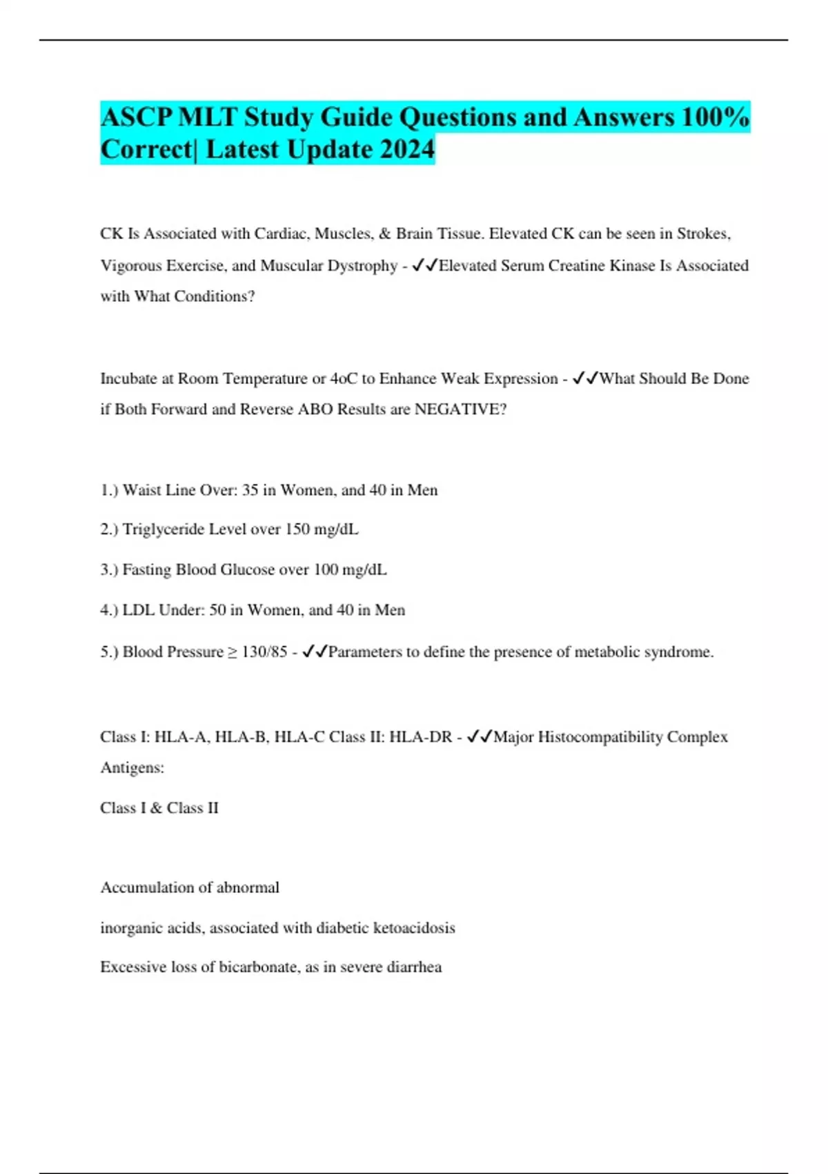CK Is Associated with Cardiac, Muscles, & Brain Tissue. Elevated CK can be seen in Strokes, Vigorous Exercise, and Muscular Dystrophy - Elevated Serum Creatine Kinase Is Associated with What Conditions? Incubate at Room Temperature or 4oC to Enhance Weak Expression - What Should Be Done if Both Forward and Reverse ABO Results are NEGATIVE? 1.) Waist Line Over: 35 in Women, and 40 in Men 2.) Triglyceride Level over 150 mg/dL 3.) Fasting Blood Glucose over 100 mg/dL 4.) LDL Under: 50 in Women, and 40 in Men 5.) Blood Pressure ≥ 130/85 - Parameters to define the presence of metabolic syndrome. Class I: HLA-A, HLA-B, HLA-C Class II: HLA-DR - Major Histocompatibility Complex Antigens: Class I & Class II Accumulation of abnormal inorganic acids, associated with diabetic ketoacidosis Excessive loss of bicarbonate, as in severe diarrheaRenal Failure - Metabolic Acidosis Caused By: pH: Decreased pCO2: Decreased - Metabolic Acidosis Blood Gas Results: Erythroid Value = Sum of all Nucleated RBC Precursors Myeloid Value = Sum of Precursor Neutrophils, Eosinophils, and Basophils *Lymphocytes and Monocytes are NOT counted* Interpreted as overall Bone Marrow Cellularity - Myeloid to Erythroid Ratio- (M:E) Ratio: Myoglolbin - Earliest Biochemical Marker for Myocardial Infraction Lectin from the seeds of Dolichos Biflorus - Anti-A1 Reagent is Made from What? Rickettsia Rickettsii - Rocky Mountain Spotted Fever is Transmitted by a Tick Infected with what? Oligopeptide in the blood that cause vasoconstriction of arterioles, increases blood pressure and releases aldosterone. - Angiotensin 2