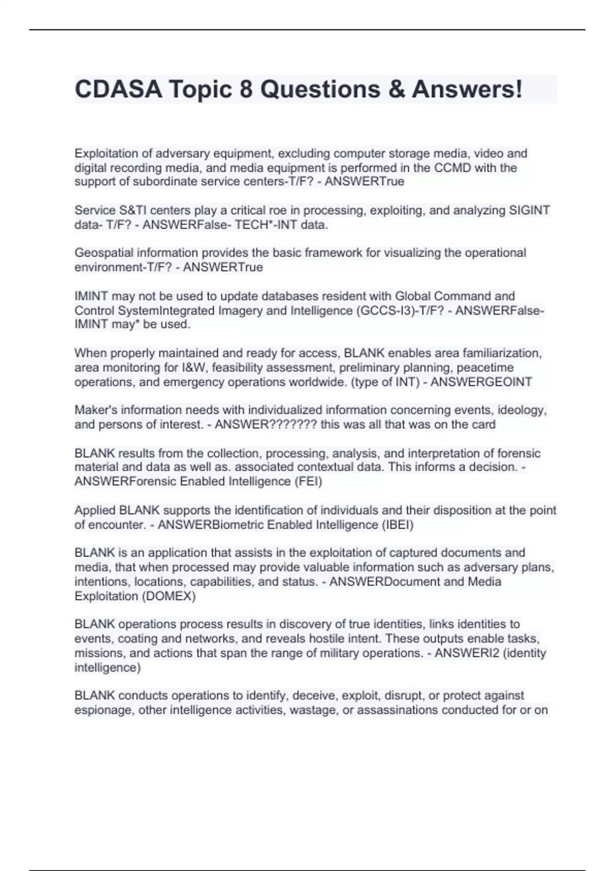 Exploitation of adversary equipment, excluding computer storage media, video and digital recording media, and media equipment is performed in the CCMD with the support of subordinate service centers-T/F? - ANSWERTrue Service S&TI centers play a critical roe in processing, exploiting, and analyzing SIGINT data- T/F? - ANSWERFalse- TECH*-INT data. Geospatial information provides the basic framework for visualizing the operational environment-T/F? - ANSWERTrue IMINT may not be used to update databases resident with Global Command and Control SystemIntegrated Imagery and Intelligence (GCCS-I3)-T/F? - ANSWERFalse-IMINT may* be used. When properly maintained and ready for access, BLANK enables area familiarization, area monitoring for I&W, feasibility assessment, preliminary planning, peacetime operations, and emergency operations worldwide. (type of INT) - ANSWERGEOINT Maker's information needs with individualized information concerning events, ideology, and persons of interest. - ANSWER??????? this was all that was on the card BLANK results from the collection, processing, analysis, and interpretation of forensic material and data as well as. associated contextual data. This informs a decision. - ANSWERForensic Enabled Intelligence (FEI) Applied BLANK supports the identification of individuals and their disposition at the point of encounter. - ANSWERBiometric Enabled Intelligence (IBEI) BLANK is an application that assists in the exploitation of captured documents and media, that when processed may provide valuable information such as adversary plans, intentions, locations, capabilities, and status. - ANSWERDocument and Media Exploitation (DOMEX) BLANK operations process results in discovery of true identities, links identities to events, coating and networks, and reveals hostile intent. These outputs enable tasks, missions, and actions that span the range of military operations. - ANSWERI2 (identity intelligence) BLANK conducts operations to identify, deceive, exploit, disrupt, or protect against espionage, other intelligence activities, wastage, or assassinations conducted for or on behalf of foreign powers, organizations , or persons or their agents, or international terrorist organizations or activities. - ANSWERCounterintelligence The BLANK Joint Foreign Material Program Office is the primary DoD contingency TECHINT capability that also manages the Joint Captured Materiel Exploitation Center (JCMEC). - ANSWERDIA BLANK is derived from the exploitation of foreign material and scientific information. - ANSWERTECHINT? (The answers on the cards were ELINT, MASINT-TA, MASINT, FISINT)