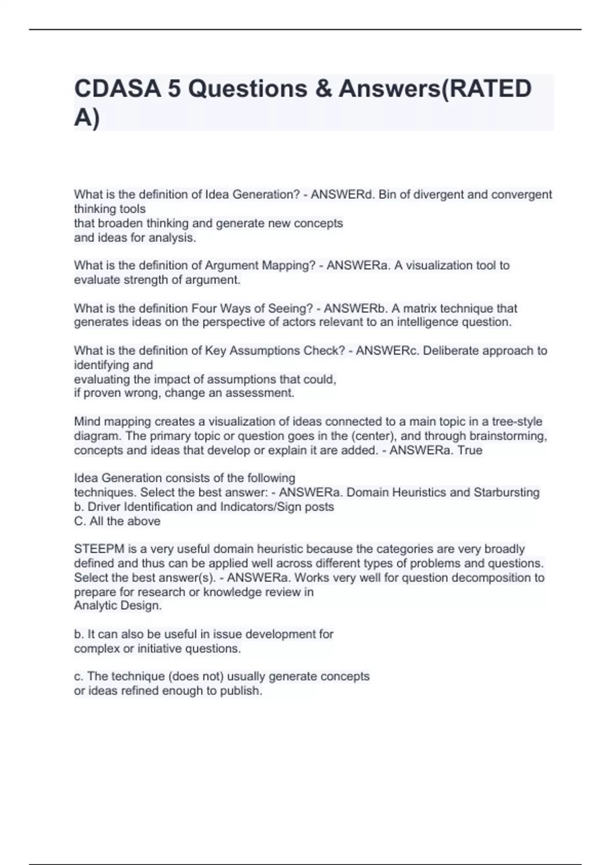 What is the definition of Idea Generation? - ANSWERd. Bin of divergent and convergent thinking tools that broaden thinking and generate new concepts and ideas for analysis. What is the definition of Argument Mapping? - ANSWERa. A visualization tool to evaluate strength of argument. What is the definition Four Ways of Seeing? - ANSWERb. A matrix technique that generates ideas on the perspective of actors relevant to an intelligence question. What is the definition of Key Assumptions Check? - ANSWERc. Deliberate approach to identifying and evaluating the impact of assumptions that could, if proven wrong, change an assessment. Mind mapping creates a visualization of ideas connected to a main topic in a tree-style diagram. The primary topic or question goes in the (center), and through brainstorming, concepts and ideas that develop or explain it are added. - ANSWERa. True Idea Generation consists of the following techniques. Select the best answer: - ANSWERa. Domain Heuristics and Starbursting b. Driver Identification and Indicators/Sign posts C. All the above STEEPM is a very useful domain heuristic because the categories are very broadly defined and thus can be applied well across different types of problems and questions. Select the best answer(s). - ANSWERa. Works very well for question decomposition to prepare for research or knowledge review in Analytic Design. b. It can also be useful in issue development for complex or initiative questions. c. The technique (does not) usually generate concepts or ideas refined enough to publish.