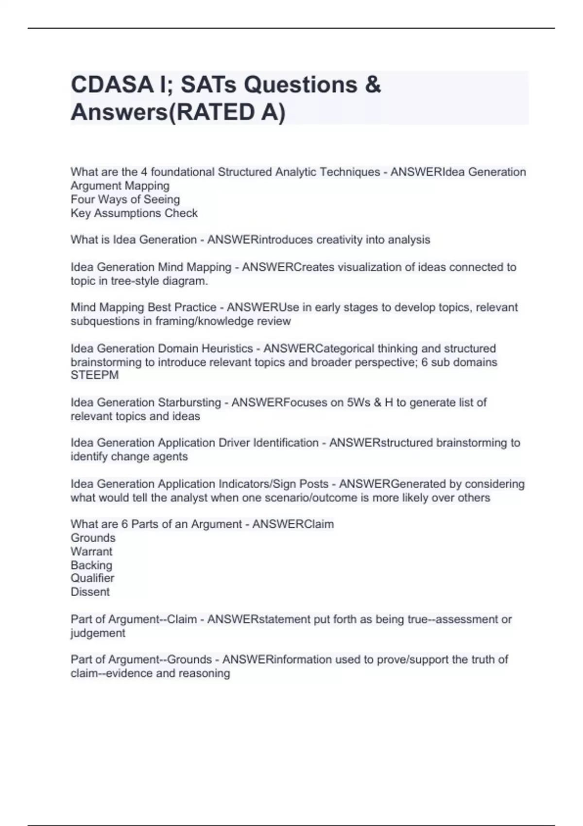 What are the 4 foundational Structured Analytic Techniques - ANSWERIdea Generation Argument Mapping Four Ways of Seeing Key Assumptions Check What is Idea Generation - ANSWERintroduces creativity into analysis Idea Generation Mind Mapping - ANSWERCreates visualization of ideas connected to topic in tree-style diagram. Mind Mapping Best Practice - ANSWERUse in early stages to develop topics, relevant subquestions in framing/knowledge review Idea Generation Domain Heuristics - ANSWERCategorical thinking and structured brainstorming to introduce relevant topics and broader perspective; 6 sub domains STEEPM Idea Generation Starbursting - ANSWERFocuses on 5Ws & H to generate list of relevant topics and ideas Idea Generation Application Driver Identification - ANSWERstructured brainstorming to identify change agents Idea Generation Application Indicators/Sign Posts - ANSWERGenerated by considering what would tell the analyst when one scenario/outcome is more likely over others What are 6 Parts of an Argument - ANSWERClaim Grounds Warrant Backing Qualifier Dissent Part of Argument--Claim - ANSWERstatement put forth as being true--assessment or judgement Part of Argument--Grounds - ANSWERinformation used to prove/support the truth of claim--evidence and reasoning Pa