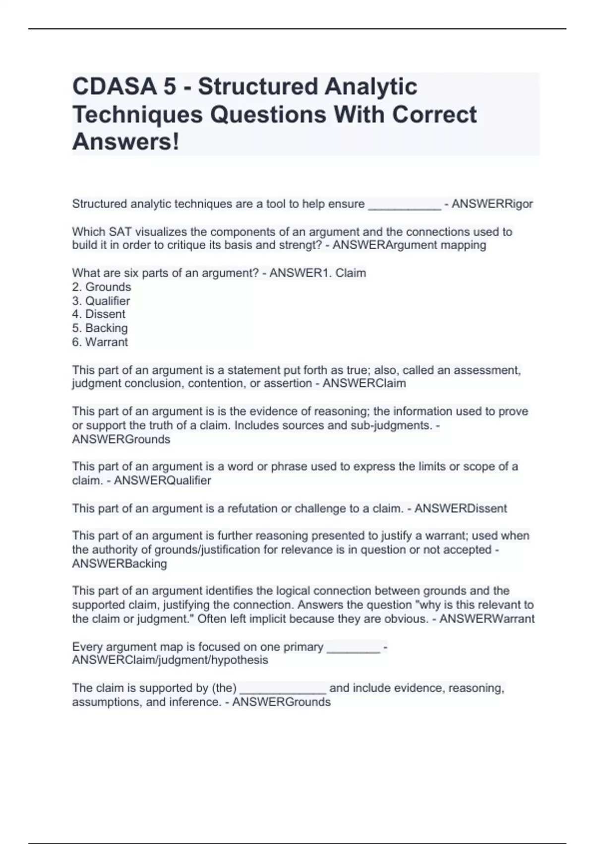 Structured analytic techniques are a tool to help ensure ___________ - ANSWERRigor Which SAT visualizes the components of an argument and the connections used to build it in order to critique its basis and strengt? - ANSWERArgument mapping What are six parts of an argument? - ANSWER1. Claim 2. Grounds 3. Qualifier 4. Dissent 5. Backing 6. Warrant This part of an argument is a statement put forth as true; also, called an assessment, judgment conclusion, contention, or assertion - ANSWERClaim This part of an argument is is the evidence of reasoning; the information used to prove or support the truth of a claim. Includes sources and sub-judgments. - ANSWERGrounds This part of an argument is a word or phrase used to express the limits or scope of a claim. - ANSWERQualifier This part of an argument is a refutation or challenge to a claim. - ANSWERDissent This part of an argument is further reasoning presented to justify a warrant; used when the authority of grounds/justification for relevance is in question or not accepted - ANSWERBacking This part of an argument identifies the logical connection between grounds and the supported claim, justifying the connection. Answers the question "why is this relevant to the claim or judgment." Often left implicit because they are obvious. - ANSWERWarrant Every argument map is focused on one primary ________ - ANSWERClaim/judgment/hypothesis The claim is supported by (the) _____________ and include evidence, reasoning, assumptions, and inference. - ANSWERGrounds Warrants are represented by _______ on an argument map that connect the ____ to the _____ - ANSWERLines, Claim, Grounds What are the three forms of resolution to dissent? - ANSWER1. Refute 2. Concession 3. Prove irrelevance When should an analyst use argument mapping? - ANSWERAfter analysis and to understand an argument's strength - product evaluation
