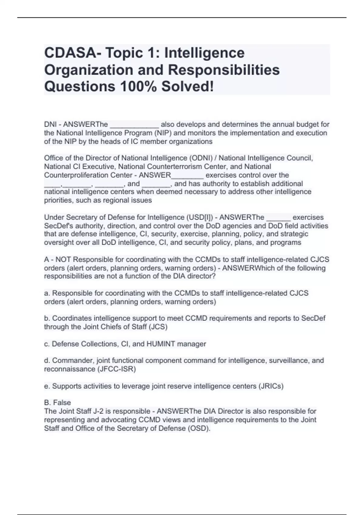 CDASA- Topic 1: Intelligence Organization and Responsibilities Questions 100% Solved!