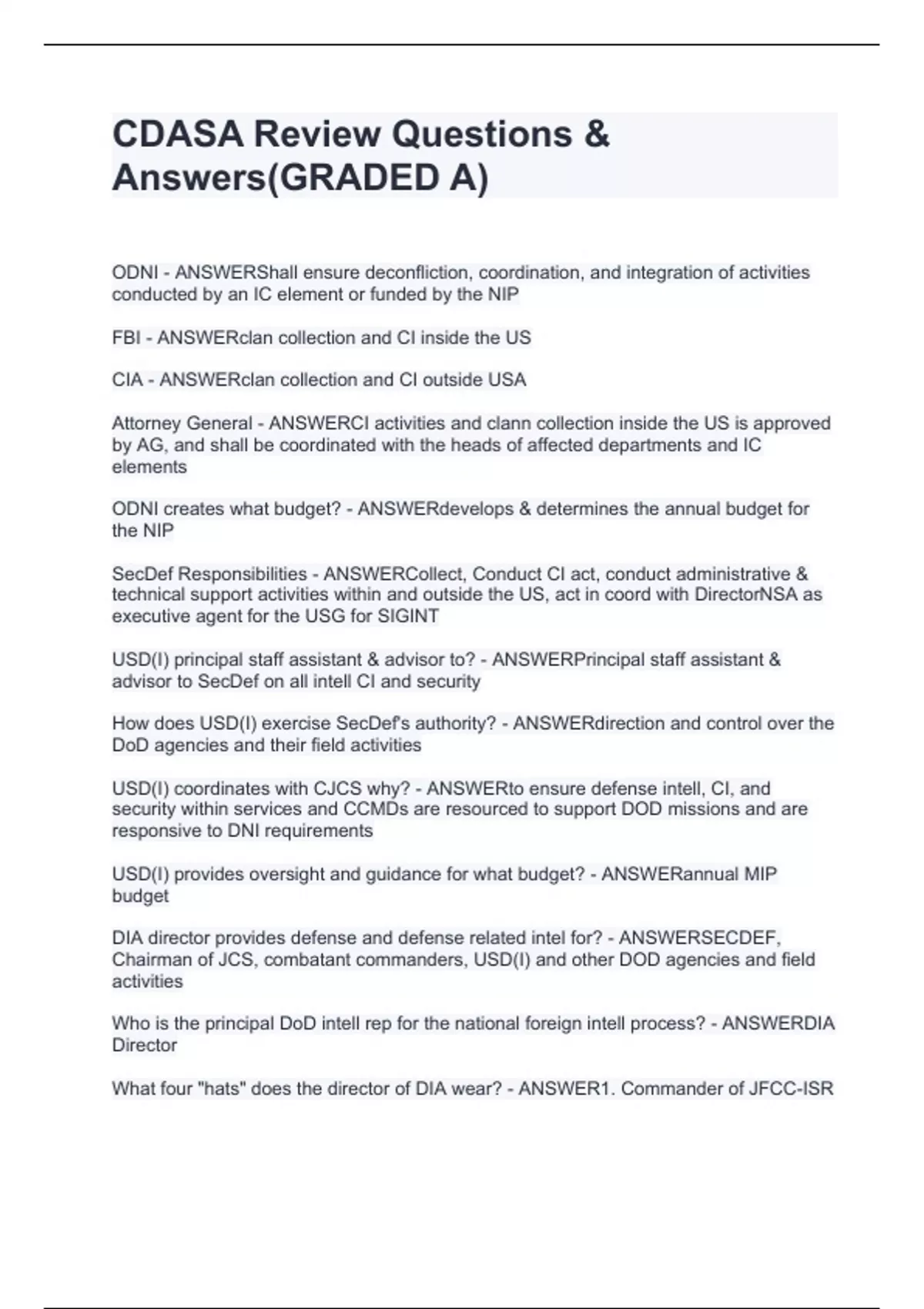 ODNI - ANSWERShall ensure deconfliction, coordination, and integration of activities conducted by an IC element or funded by the NIP FBI - ANSWERclan collection and CI inside the US CIA - ANSWERclan collection and CI outside USA Attorney General - ANSWERCI activities and clann collection inside the US is approved by AG, and shall be coordinated with the heads of affected departments and IC elements ODNI creates what budget? - ANSWERdevelops & determines the annual budget for the NIP SecDef Responsibilities - ANSWERCollect, Conduct CI act, conduct administrative & technical support activities within and outside the US, act in coord with DirectorNSA as executive agent for the USG for SIGINT USD(I) principal staff assistant & advisor to? - ANSWERPrincipal staff assistant & advisor to SecDef on all intell CI and security How does USD(I) exercise SecDef's authority? - ANSWERdirection and control over the DoD agencies and their field activities USD(I) coordinates with CJCS why? - ANSWERto ensure defense intell, CI, and security within services and CCMDs are resourced to support DOD missions and are responsive to DNI requirements USD(I) provides oversight and guidance for what budget? - ANSWERannual MIP budget DIA director provides defense and defense related intel for? - ANSWERSECDEF, Chairman of JCS, combatant commanders, USD(I) and other DOD agencies and field activities Who is the principal DoD intell rep for the national foreign intell process? - ANSWERDIA Director What four "hats" does the director of DIA wear? - ANSWER1. Commander of JFCC-ISR