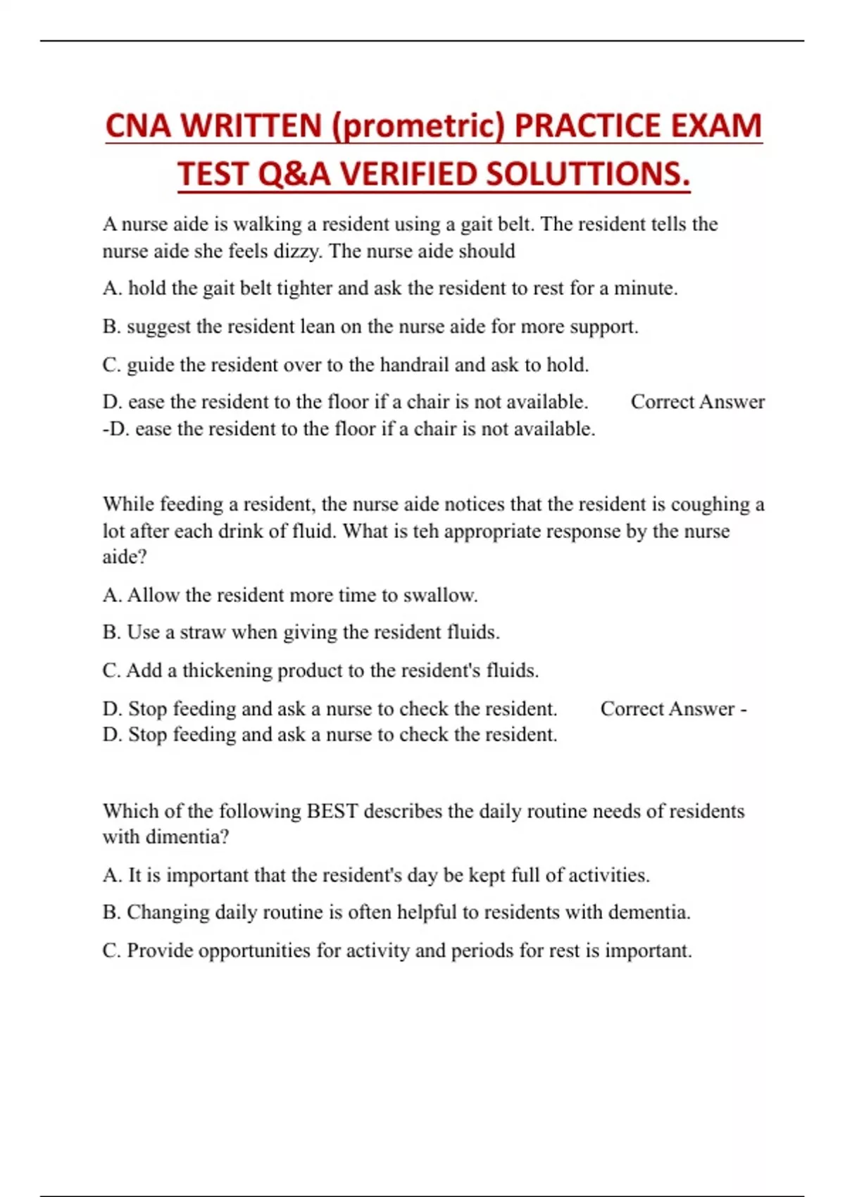 CNA WRITTEN (prometric) PRACTICE EXAM TEST Q&A VERIFIED SOLUTIONS.