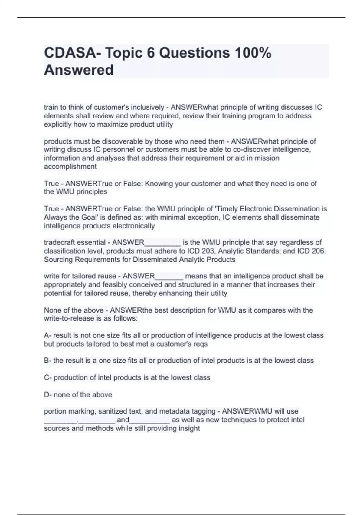 train to think of customer's inclusively - ANSWERwhat principle of writing discusses IC elements shall review and where required, review their training program to address explicitly how to maximize product utility products must be discoverable by those who need them - ANSWERwhat principle of writing discuss IC personnel or customers must be able to co-discover intelligence, information and analyses that address their requirement or aid in mission accomplishment True - ANSWERTrue or False: Knowing your customer and what they need is one of the WMU principles True - ANSWERTrue or False: the WMU principle of 'Timely Electronic Dissemination is Always the Goal' is defined as: with minimal exception, IC elements shall disseminate intelligence products electronically tradecraft essential - ANSWER_________ is the WMU principle that say regardless of classification level, products must adhere to ICD 203, Analytic Standards; and ICD 206, Sourcing Requirements for Disseminated Analytic Products write for tailored reuse - ANSWER_______ means that an intelligence product shall be appropriately and feasibly conceived and structured in a manner that increases their potential for tailored reuse, thereby enhancing their utility None of the above - ANSWERthe best description for WMU as it compares with the write-to-release is as follows: A- result is not one size fits all or production of intelligence products at the lowest class but products tailored to best met a customer's reqs B- the result is a one size fits all or production of intel products is at the lowest class C- production of intel products is at the lowest class D- none of the above portion marking, sanitized text, and metadata tagging - ANSWERWMU will use ________._________.and__________ as well as new techniques to protect intel sources and methods while still providing insight True - ANSWERTrue or False: the goal of WMU is to ensure that the IC produces intel that communicates the right info in the right form to the right people at the right time 208; plan, organize, write, and disseminate intelligence products - ANSWERICD ____ establishes fundamental intel production principles and a common perspective from which to ____. _______, _____, and ________ that provide the greatest use to customers
