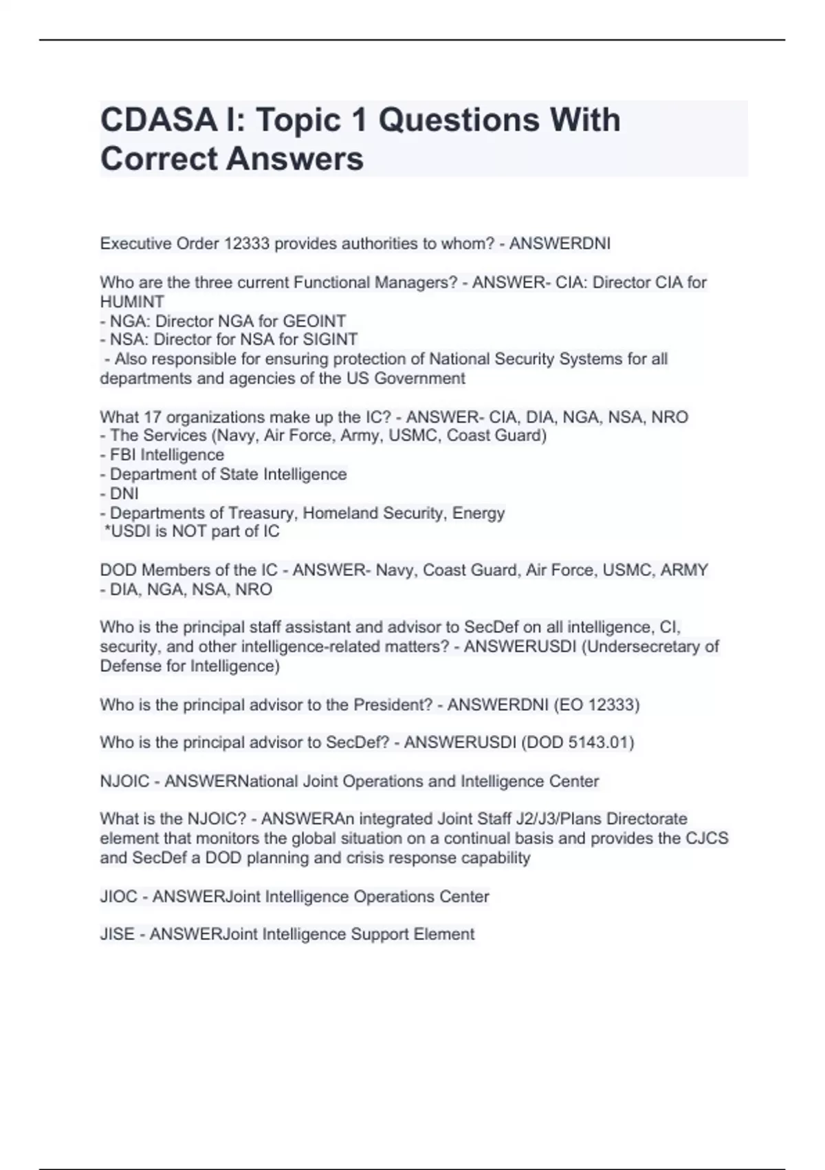 Executive Order 12333 provides authorities to whom? - ANSWERDNI Who are the three current Functional Managers? - ANSWER- CIA: Director CIA for HUMINT - NGA: Director NGA for GEOINT - NSA: Director for NSA for SIGINT - Also responsible for ensuring protection of National Security Systems for all departments and agencies of the US Government What 17 organizations make up the IC? - ANSWER- CIA, DIA, NGA, NSA, NRO - The Services (Navy, Air Force, Army, USMC, Coast Guard) - FBI Intelligence - Department of State Intelligence - DNI - Departments of Treasury, Homeland Security, Energy *USDI is NOT part of IC DOD Members of the IC - ANSWER- Navy, Coast Guard, Air Force, USMC, ARMY - DIA, NGA, NSA, NRO Who is the principal staff assistant and advisor to SecDef on all intelligence, CI, security, and other intelligence-related matters? - ANSWERUSDI (Undersecretary of Defense for Intelligence) Who is the principal advisor to the President? - ANSWERDNI (EO 12333) Who is the principal advisor to SecDef? - ANSWERUSDI (DOD 5143.01) NJOIC - ANSWERNational Joint Operations and Intelligence Center What is the NJOIC? - ANSWERAn integrated Joint Staff J2/J3/Plans Directorate element that monitors the global situation on a continual basis and provides the CJCS and SecDef a DOD planning and crisis response capability JIOC - ANSWERJoint Intelligence Operations Center JISE - ANSWERJoint Intelligence Support Element What's the different between a JISE and JOIC? - ANSWER- CCMD JIOCS are the primary intelligence organizations providing support to joint forces - At the discretion of a subordinate JFC, a JTF JISE is normally established during the initial phases of an operation to augment the subordinate joint force J2 element What does a JIOC do? - ANSWER- Each CCMD operates a JOIC to interlink operations, planning, and all-source intelligence capabilities in support of command mission - It is the focal point for CCMD intelligence planning, collection management, analysis, and production, and supports joint operations and conducts intelligence operations ISO the Commander, staff, and subordinate commands. - Integrates all DOD intelligence, defense and national, NGO, multinational partners, law enforcement, etc What is the purpose of DODD 5143.01? - ANSWEREstablished USDI as the lead and principle staff assistant and advisor to the SecDef and DepSecDef regarding intelligence, counterintelligence, security, sensitive activities, and other intelligence-related matters STONEGHOST - ANSWERThe encrypted communications network designed to support collaboration and intelligence sharing between the US Defense IC and its