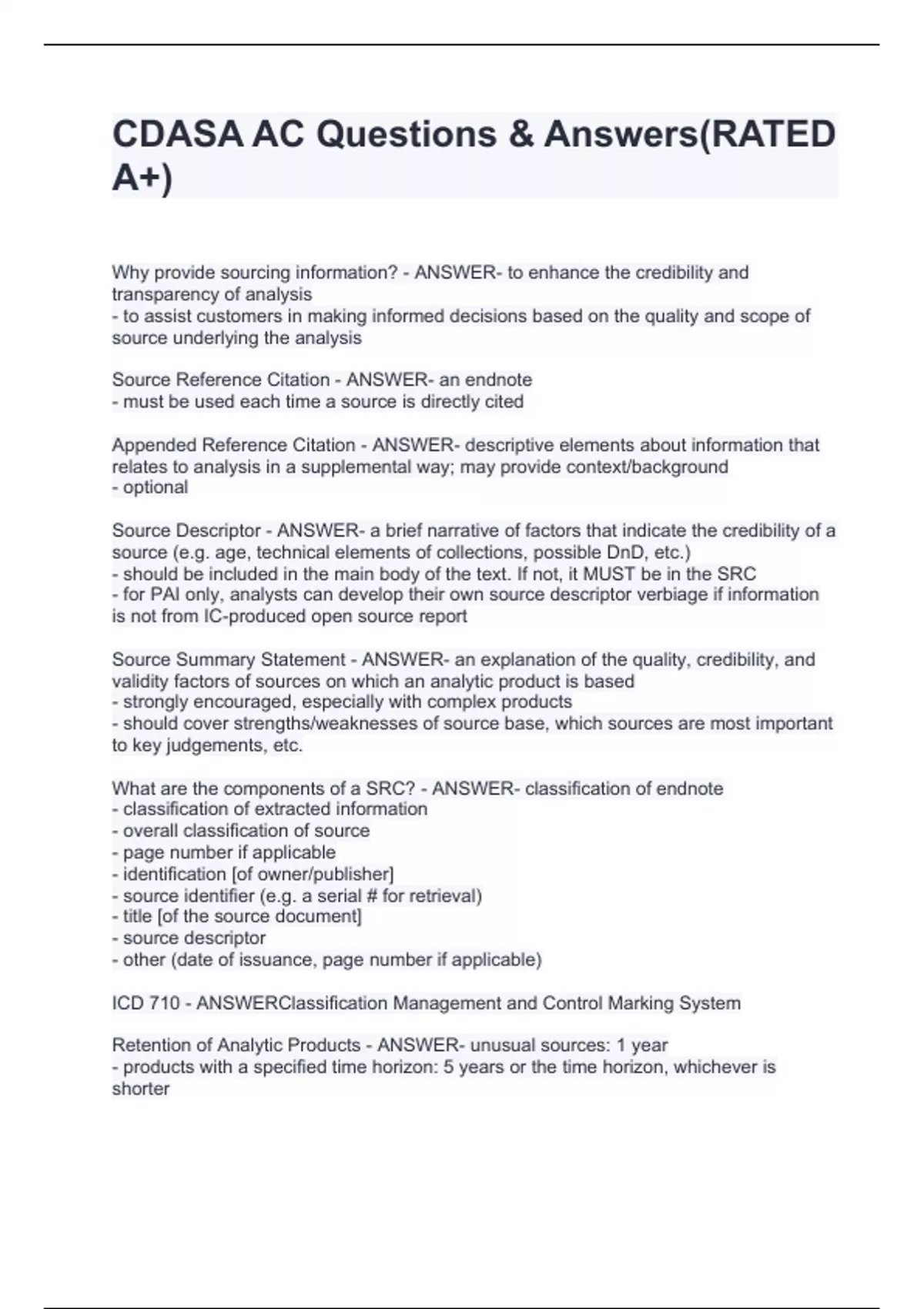 Why provide sourcing information? - ANSWER- to enhance the credibility and transparency of analysis - to assist customers in making informed decisions based on the quality and scope of source underlying the analysis Source Reference Citation - ANSWER- an endnote - must be used each time a source is directly cited Appended Reference Citation - ANSWER- descriptive elements about information that relates to analysis in a supplemental way; may provide context/background - optional Source Descriptor - ANSWER- a brief narrative of factors that indicate the credibility of a source (e.g. age, technical elements of collections, possible DnD, etc.) - should be included in the main body of the text. If not, it MUST be in the SRC - for PAI only, analysts can develop their own source descriptor verbiage if information is not from IC-produced open source report Source Summary Statement - ANSWER- an explanation of the quality, credibility, and validity factors of sources on which an analytic product is based - strongly encouraged, especially with complex products - should cover strengths/weaknesses of source base, which sources are most important to key judgements, etc. What are the components of a SRC? - ANSWER- classification of endnote - classification of extracted information - overall classification of source - page number if applicable - identification [of owner/publisher] - source identifier (e.g. a serial # for retrieval) - title [of the source document] - source descriptor - other (date of issuance, page number if applicable) ICD 710 - ANSWERClassification Management and Control Marking System Retention of Analytic Products - ANSWER- unusual sources: 1 year - products with a specified time horizon: 5 years or the time horizon, whichever is shorter