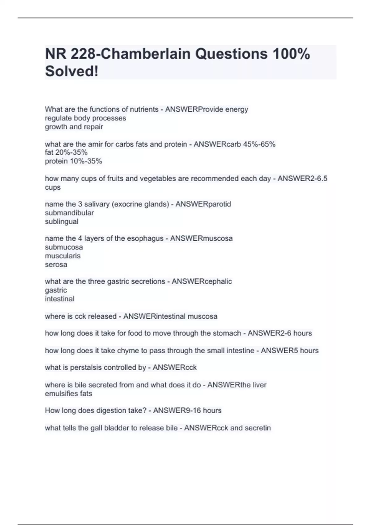 What are the functions of nutrients - ANSWERProvide energy regulate body processes growth and repair what are the amir for carbs fats and protein - ANSWERcarb 45%-65% fat 20%-35% protein 10%-35% how many cups of fruits and vegetables are recommended each day - ANSWER2-6.5 cups name the 3 salivary (exocrine glands) - ANSWERparotid submandibular sublingual name the 4 layers of the esophagus - ANSWERmuscosa submucosa muscularis serosa what are the three gastric secretions - ANSWERcephalic gastric intestinal where is cck released - ANSWERintestinal muscosa how long does it take for food to move through the stomach - ANSWER2-6 hours how long does it take chyme to pass through the small intestine - ANSWER5 hours what is perstalsis controlled by - ANSWERcck where is bile secreted from and what does it do - ANSWERthe liver emulsifies fats How long does digestion take? - ANSWER9-16 hours what tells the gall bladder to release bile - ANSWERcck and secretin