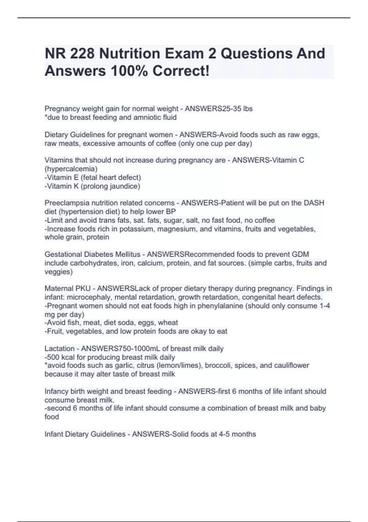 Pregnancy weight gain for normal weight - ANSWERS25-35 lbs *due to breast feeding and amniotic fluid Dietary Guidelines for pregnant women - ANSWERS-Avoid foods such as raw eggs, raw meats, excessive amounts of coffee (only one cup per day) Vitamins that should not increase during pregnancy are - ANSWERS-Vitamin C (hypercalcemia) -Vitamin E (fetal heart defect) -Vitamin K (prolong jaundice) Preeclampsia nutrition related concerns - ANSWERS-Patient will be put on the DASH diet (hypertension diet) to help lower BP -Limit and avoid trans fats, sat. fats, sugar, salt, no fast food, no coffee -Increase foods rich in potassium, magnesium, and vitamins, fruits and vegetables, whole grain, protein Gestational Diabetes Mellitus - ANSWERSRecommended foods to prevent GDM include carbohydrates, iron, calcium, protein, and fat sources. (simple carbs, fruits and veggies) Maternal PKU - ANSWERSLack of proper dietary therapy during pregnancy. Findings in infant: microcephaly, mental retardation, growth retardation, congenital heart defects. -Pregnant women should not eat foods high in phenylalanine (should only consume 1-4 mg per day) -Avoid fish, meat, diet soda, eggs, wheat -Fruit, vegetables, and low protein foods are okay to eat Lactation - ANSWERS750-1000mL of breast milk daily -500 kcal for producing breast milk daily *avoid foods such as garlic, citrus (lemon/limes), broccoli, spices, and cauliflower because it may alter taste of breast milk Infancy birth weight and breast feeding - ANSWERS-first 6 months of life infant should consume breast milk. -second 6 months of life infant should consume a combination of breast milk and baby food Infant Dietary Guidelines - ANSWERS-Solid foods at 4-5 months -if exclusively breastfeeding, baby should be taking in an iron supplement at 4 months old to avoid iron deficiency anemia. Infancy and Fat Consumption - ANSWERS-Fat and cholesterol consumption is important in brain growth and development and nerve tissue -If infant is overweight, do not restrict fats
