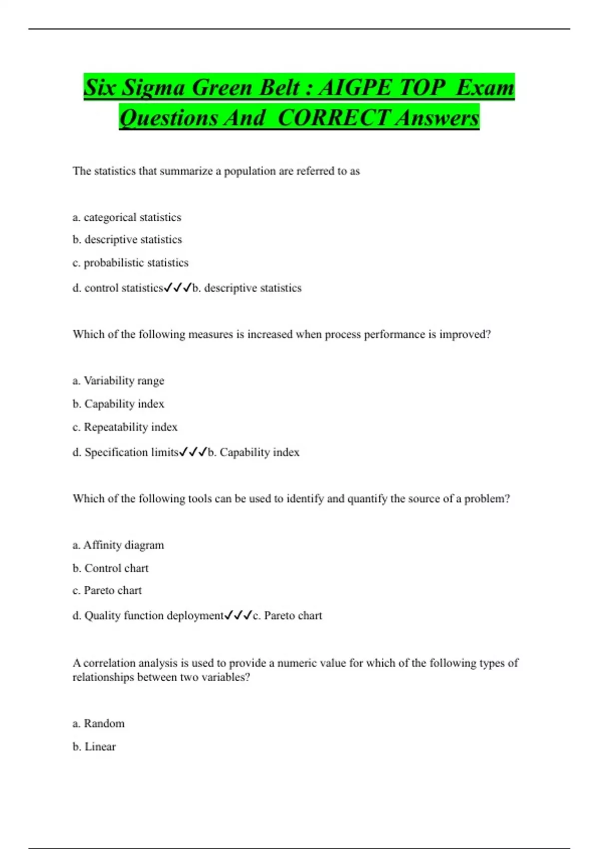 The statistics that summarize a population are referred to as a. categorical statistics b. descriptive statistics c. probabilistic statistics d. control statisticsb. descriptive statistics Which of the following measures is increased when process performance is improved? a. Variability range b. Capability index c. Repeatability index d. Specification limitsb. Capability index
