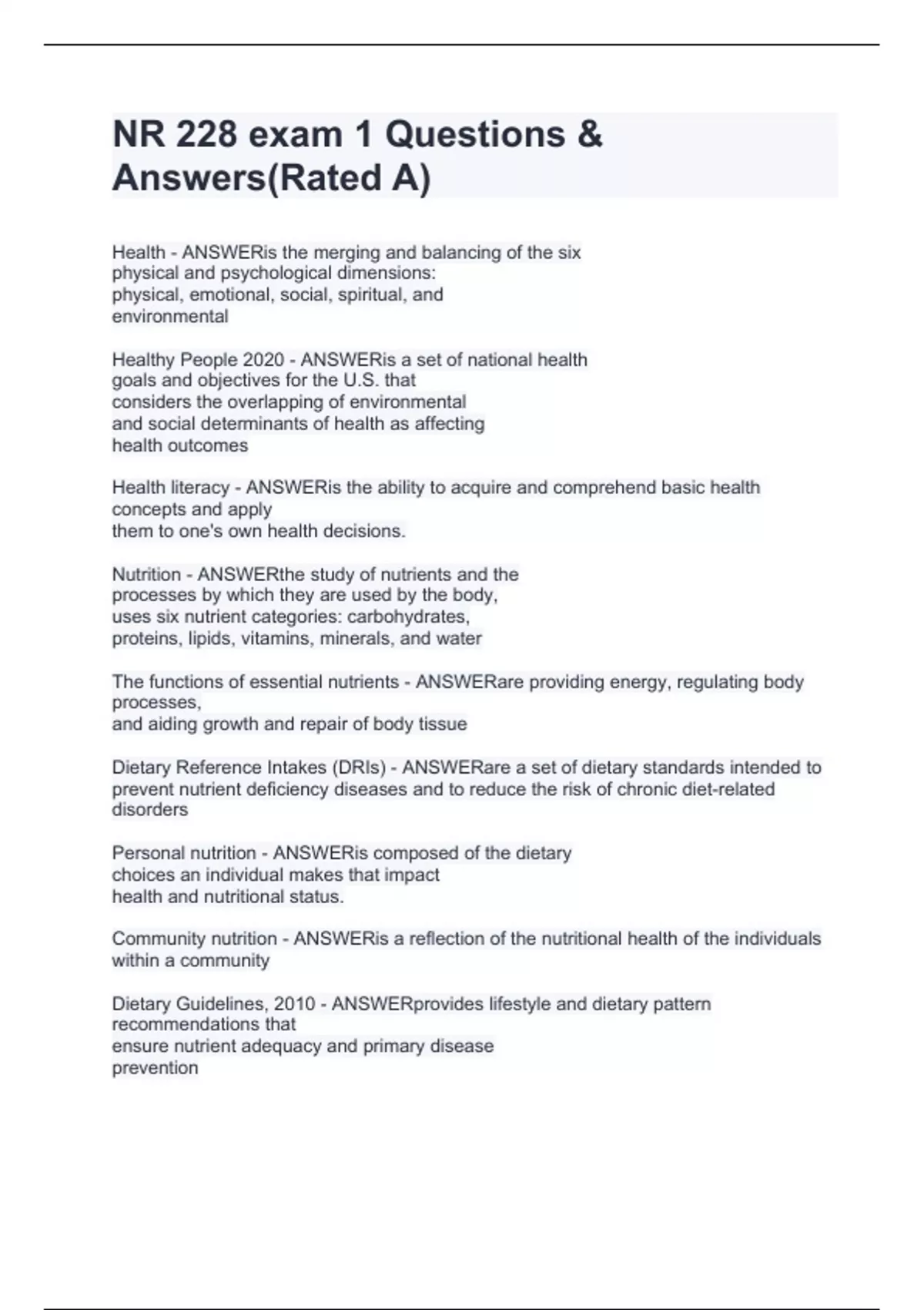Health - ANSWERis the merging and balancing of the six physical and psychological dimensions: physical, emotional, social, spiritual, and environmental Healthy People 2020 - ANSWERis a set of national health goals and objectives for the U.S. that considers the overlapping of environmental and social determinants of health as affecting health outcomes Health literacy - ANSWERis the ability to acquire and comprehend basic health concepts and apply them to one's own health decisions. Nutrition - ANSWERthe study of nutrients and the processes by which they are used by the body, uses six nutrient categories: carbohydrates, proteins, lipids, vitamins, minerals, and water The functions of essential nutrients - ANSWERare providing energy, regulating body processes, and aiding growth and repair of body tissue Dietary Reference Intakes (DRIs) - ANSWERare a set of dietary standards intended to prevent nutrient deficiency diseases and to reduce the risk of chronic diet-related disorders Personal nutrition - ANSWERis composed of the dietary choices an individual makes that impact health and nutritional status. Community nutrition - ANSWERis a reflection of the nutritional health of the individuals within a community Dietary Guidelines, 2010 - ANSWERprovides lifestyle and dietary pattern recommendations that ensure nutrient adequacy and primary disease prevention The requirement for consumer information on food product packaging - ANSWERincreases the probability that decisions about food choices are based on nutritional value GI tract organs - ANSWERthe mouth, esophagus, stomach, small intestine, and large intestine Di