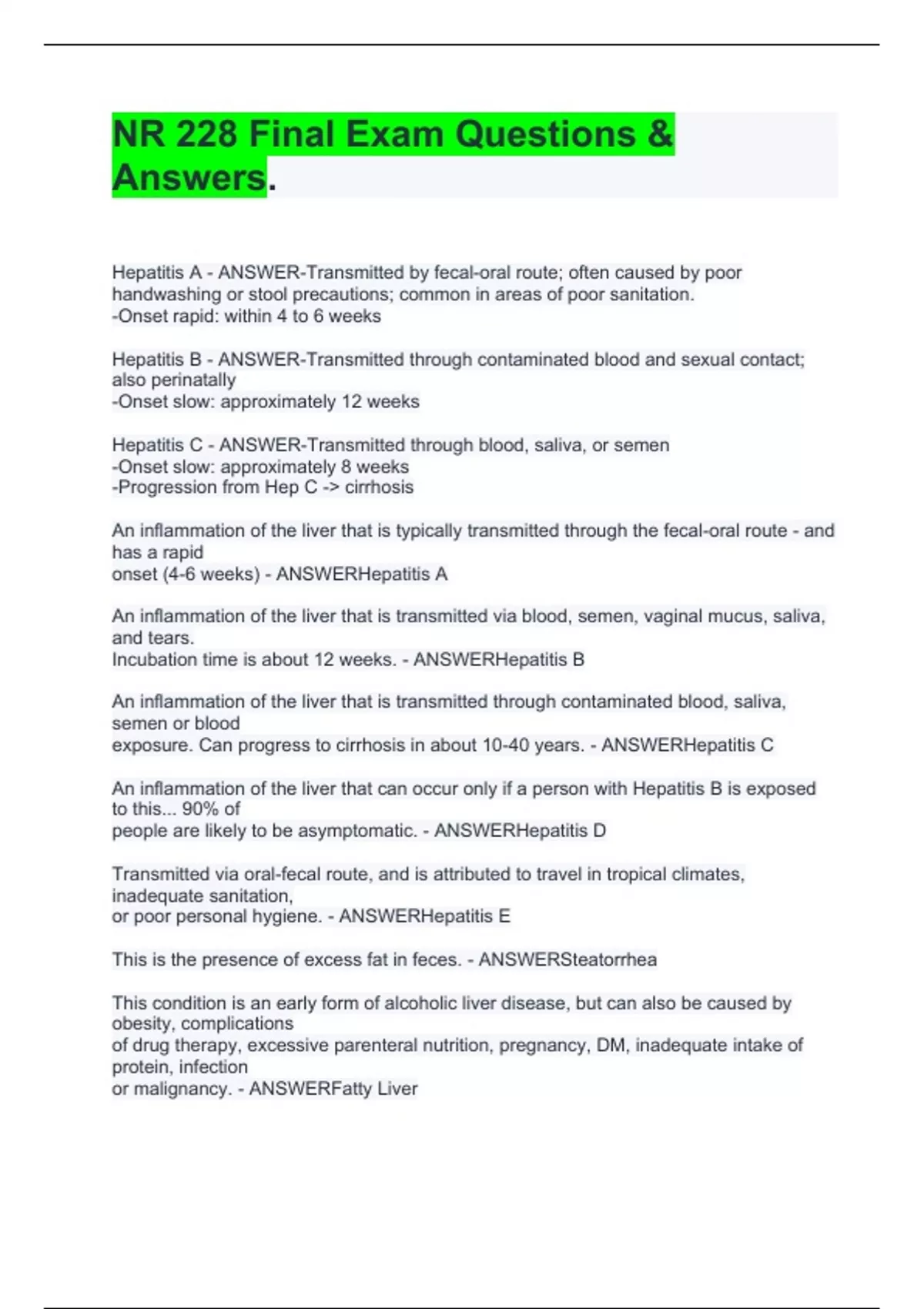 Hepatitis A - ANSWER-Transmitted by fecal-oral route; often caused by poor handwashing or stool precautions; common in areas of poor sanitation. -Onset rapid: within 4 to 6 weeks Hepatitis B - ANSWER-Transmitted through contaminated blood and sexual contact; also perinatally -Onset slow: approximately 12 weeks Hepatitis C - ANSWER-Transmitted through blood, saliva, or semen -Onset slow: approximately 8 weeks -Progression from Hep C -> cirrhosis An inflammation of the liver that is typically transmitted through the fecal-oral route - and has a rapid onset (4-6 weeks) - ANSWERHepatitis A An inflammation of the liver that is transmitted via blood, semen, vaginal mucus, saliva, and tears. Incubation time is about 12 weeks. - ANSWERHepatitis B An inflammation of the liver that is transmitted through contaminated blood, saliva, semen or blood exposure. Can progress to cirrhosis in about 10-40 years. - ANSWERHepatitis C An inflammation of the liver that can occur only if a person with Hepatitis B is exposed to this... 90% of people are likely to be asymptomatic. - ANSWERHepatitis D Transmitted via oral-fecal route, and is attributed to travel in tropical climates, inadequate sanitation, or poor personal hygiene. - ANSWERHepatitis E This is the presence of excess fat in feces. - ANSWERSteatorrhea This condition is an early form of alcoholic liver disease, but can also be caused by obesity, complications of drug therapy, excessive parenteral nutrition, pregnancy, DM, inadequate intake of protein, infection or malignancy. - ANSWERFatty Liver