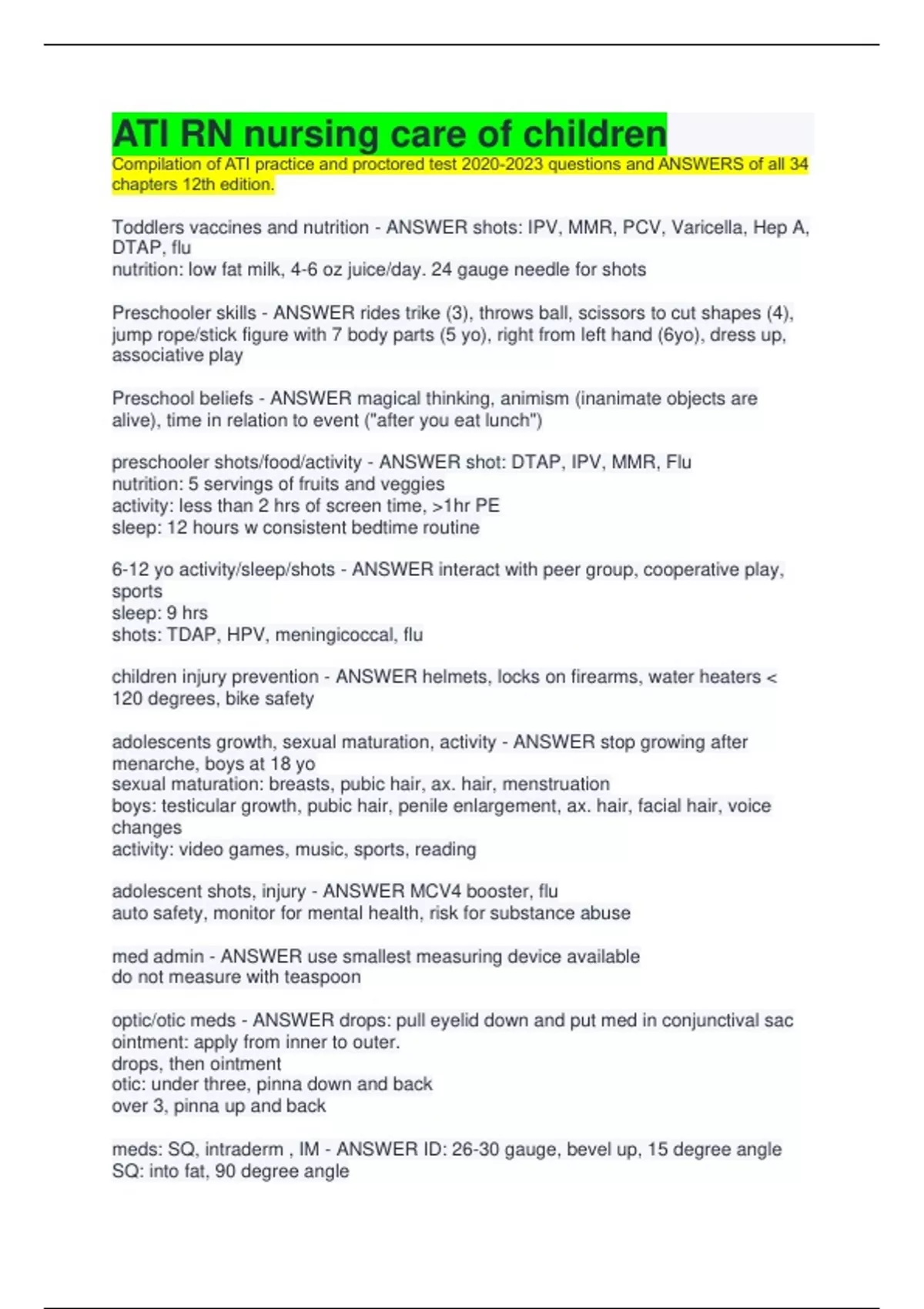 ATI RN nursing care of children Compilation of ATI practice and proctored test questions and ANSWERS of all 34 chapters 12th edition.