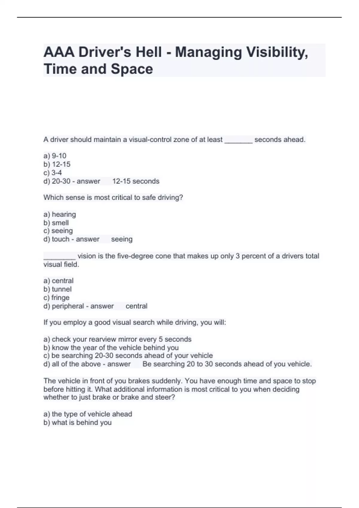 AAA Driver's Hell - Managing Visibility, Time and Space Questions with correct Answers 2024