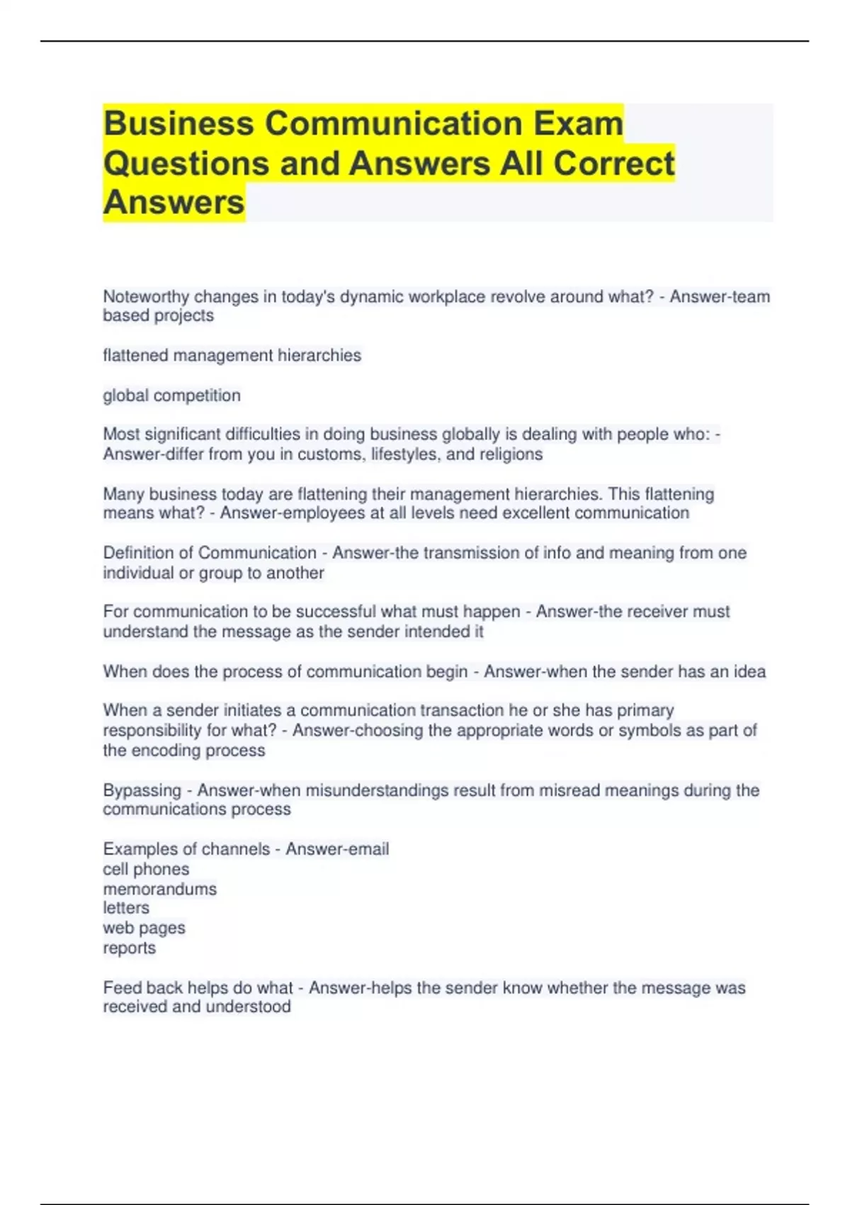 Business Communication Exam Questions and Answers All Correct Answers Noteworthy changes in today's dynamic workplace revolve around what? - Answer-team based projects flattened management hierarchies global competition Most significant difficulties in doing business globally is dealing with people who: - Answer-differ from you in customs, lifestyles, and religions Many business today are flattening their management hierarchies. This flattening means what? - Answer-employees at all levels need excellent communication Definition of Communication - Answer-the transmission of info and meaning from one individual or group to another For communication to be successful what must happen - Answer-the receiver must understand the message as the sender intended it When does the process of communication begin - Answer-when the sender has an idea When a sender initiates a communication transaction he or she has primary responsibility for what? - Answer-choosing the appropriate words or symbols as part of the encoding process Bypassing - Answer-when misunderstandings result from misread meanings during the communications process Examples of channels - Answer-email cell phones memorandums letters web pages reports Feed back helps do what - Answer-helps the sender know whether the message was received and understood When are differences in frames of reference especially significant - Answer-when communicating with people from different cultures 3 basic functions of business communication - Answer-inform persuade promote goodwill When is written communication preferred - Answer-when a permanent record is needed Example of downward communication - Answer-supervisor sends an email message to all division employees detailing the newest procedure for submitting expenses Example of an informal organizational communication channel - Answer-an employee starts a blog on which she shares personal work experiences, opinions and observation