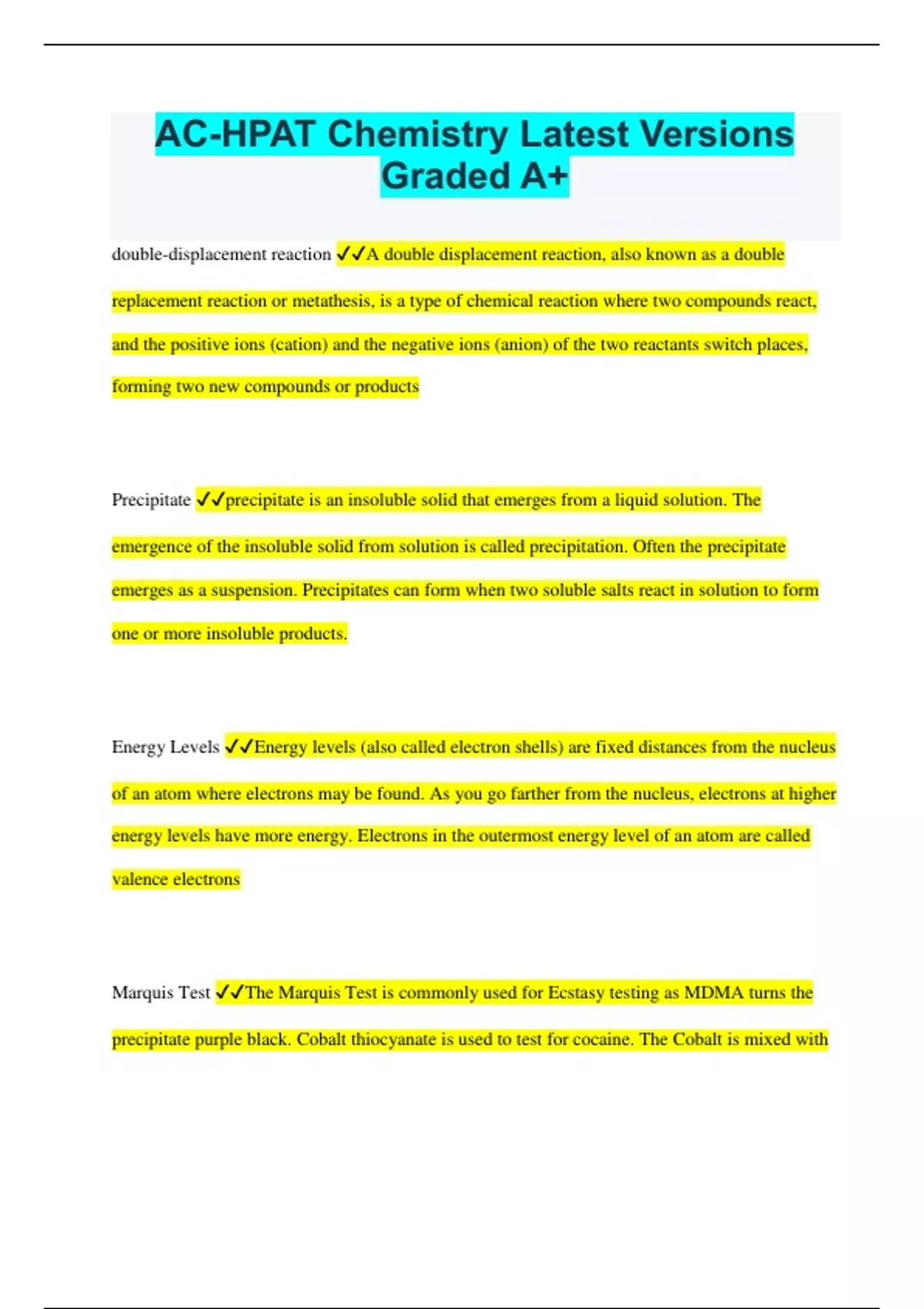 AC-HPAT Chemistry Latest Versions Graded A+ double-displacement reaction A double displacement reaction, also known as a double replacement reaction or metathesis, is a type of chemical reaction where two compounds react, and the positive ions (cation) and the negative ions (anion) of the two reactants switch places, forming two new compounds or products Precipitate precipitate is an insoluble solid that emerges from a liquid solution. The emergence of the insoluble solid from solution is called precipitation. Often the precipitate emerges as a suspension. Precipitates can form when two soluble salts react in solution to form one or more insoluble products. Energy Levels Energy levels (also called electron shells) are fixed distances from the nucleus of an atom where electrons may be found. As you go farther from the nucleus, electrons at higher energy levels have more energy. Electrons in the outermost energy level of an atom are called valence electrons Marquis Test The Marquis Test is commonly used for Ecstasy testing as MDMA turns the precipitate purple black. Cobalt thiocyanate is used to test for cocaine. The Cobalt is mixed with the questionable substance, then drowned in hydrochloric acid, doused in chloroform, and shaken. What is the relation between an atomic number and a mass number? Atomic number is actually the number of protons in an atom while mass number is the number of nucleons i. e, number of protons plus the number of neutrons. Isotopes Isotopes refer to the nuclides of a certain element that have different numbers of neutrons, or in other words, atomic nuclei that have the same number of protons but different numbers of neutrons. A radioisotope is an isotope that is unstable and therefore undergoes radioactive decay or will at some point. Chemical Synthesis Chemical synthesis, the construction of complex chemical compounds from simpler ones. It is the process by which many substances important to daily life are obtained. It is applied to all types of chemical compounds, but most syntheses are of organic molecules. Decomposition A decomposition reaction is a type of chemical reaction in which a single compound breaks down into two or more elements or new compounds. These reactions often involve an energy source such as heat, light, or electricity that breaks apart the bonds of compounds single-displacement reaction A single-displacement reaction, also known as a single- replacement reaction, is a type of chemical reaction where an element reacts with a compound and takes the place of another element in that compound. This type of reaction is typically pictured like this: Here, A replaces B in the compound BC Flame test flame test is an analytical procedure used in chemistry to detect the presence of certain elements, primarily metal ions, based on each element's characteristic emission spectrum. The color of flames in general also depends on temperature; see flame color. Precipitation reaction A precipitation reaction refers to the formation of an insoluble salt when two solutions containing soluble salts are combined. The insoluble salt that falls out of solution is known as the precipitate, hence the reaction's name. Precipitation reactions can help determine the presence of various ions in solution. organic compounds An organic compound is a substance that is added to a product, like food, to improve some qualities such as taste, smell, colour and texture. These substances can be both positive and negative for human health. Synthetic materials Synthetic materials which are by-products of petroleum are non- biodegradable, synthetic products take a long time to decompose, creating long-term pollution. Nylon is hard to recycle, making them hard to decompose, accumulate landfills more. Polyesters are easy to recycle, which makes them less harmful to the society. Electronegativity Electronegativity is a measure of the tendency of an atom to attract a bonding pair of electrons. The Pauling scale is the most commonly used. Fluorine (the most electronegative element) is assigned a value of 4.0, and values range down to caesium and francium which are the least electronegative at 0.7.