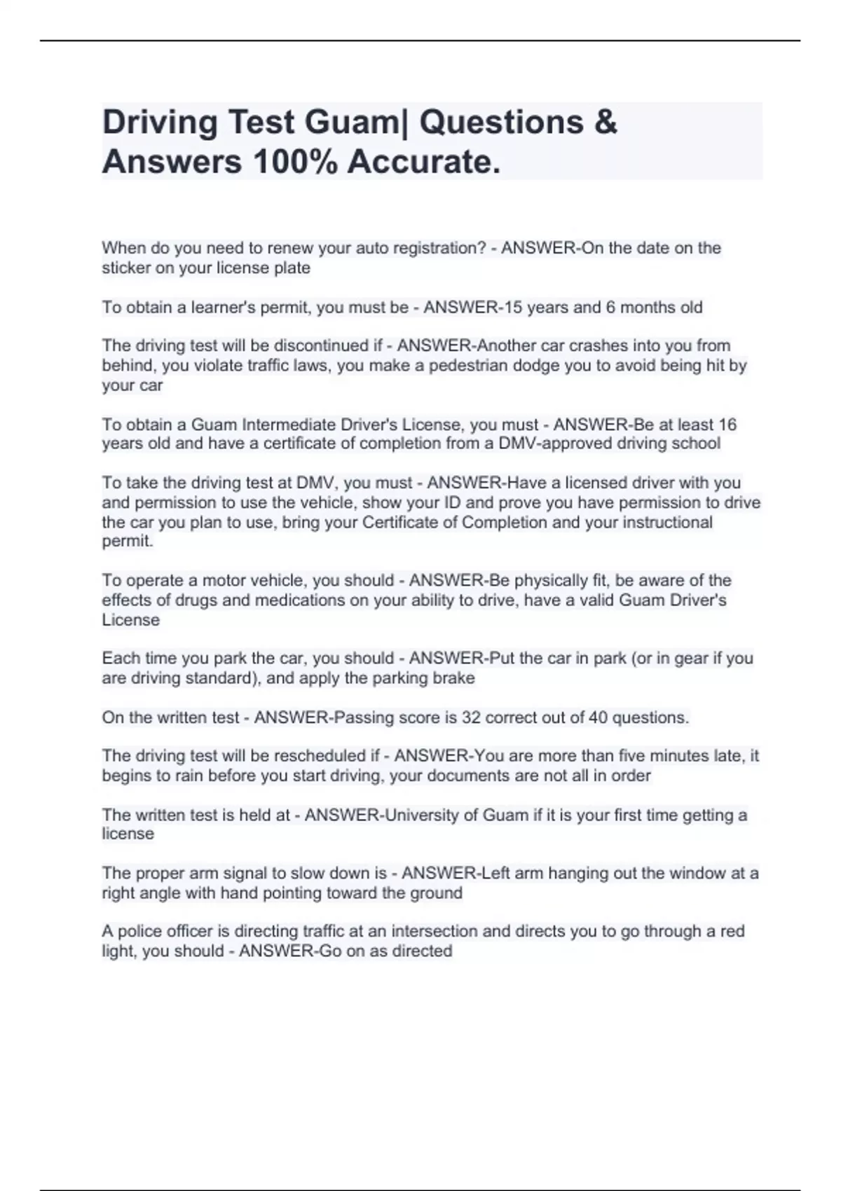 Driving Test Guam| Questions & Answers 100% Accurate. When do you need to renew your auto registration? - ANSWER-On the date on the sticker on your license plate To obtain a learner's permit, you must be - ANSWER-15 years and 6 months old The driving test will be discontinued if - ANSWER-Another car crashes into you from behind, you violate traffic laws, you make a pedestrian dodge you to avoid being hit by your car To obtain a Guam Intermediate Driver's License, you must - ANSWER-Be at least 16 years old and have a certificate of completion from a DMV-approved driving school To take the driving test at DMV, you must - ANSWER-Have a licensed driver with you and permission to use the vehicle, show your ID and prove you have permission to drive the car you plan to use, bring your Certificate of Completion and your instructional permit. To operate a motor vehicle, you should - ANSWER-Be physically fit, be aware of the effects of drugs and medications on your ability to drive, have a valid Guam Driver's License Each time you park the car, you should - ANSWER-Put the car in park (or in gear if you are driving standard), and apply the parking brake On the written test - ANSWER-Passing score is 32 correct out of 40 questions. The driving test will be rescheduled if - ANSWER-You are more than five minutes late, it begins to rain before you start driving, your documents are not all in order The written test is held at - ANSWER-University of Guam if it is your first time getting a license The proper arm signal to slow down is - ANSWER-Left arm hanging out the window at a right angle with hand pointing toward the ground A police officer is directing traffic at an intersection and directs you to go through a red light, you should - ANSWER-Go on as directed You are approaching an intersection and you observe the light is green. How should you proceed? - ANSWER-Slow down and if the light is still green, proceed through