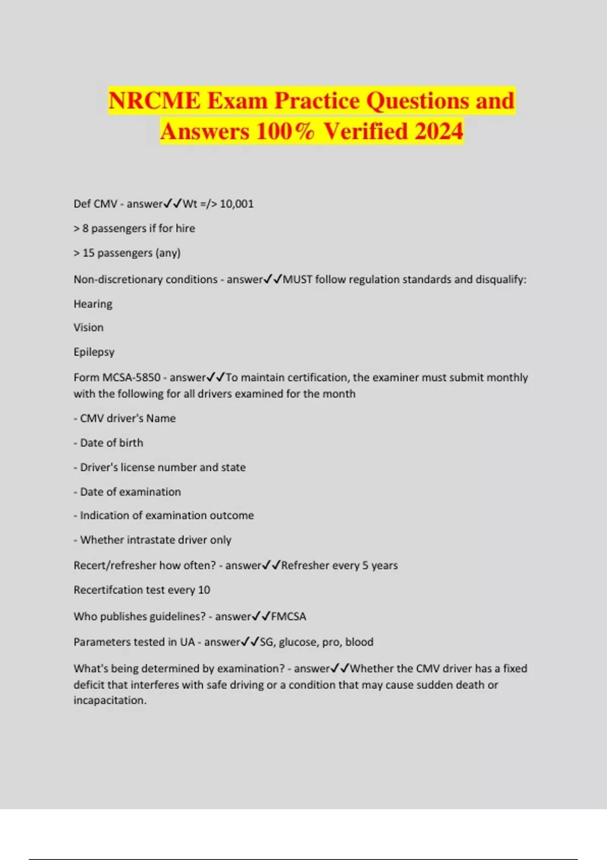 NRCME Exam Practice Questions and Answers 100% Verified 2024 Def CMV - answerWt =/> 10,001 > 8 passengers if for hire > 15 passengers (any) Non-discretionary conditions - answerMUST follow regulation standards and disqualify: Hearing Vision Epilepsy Form MCSA-5850 - answerTo maintain certification, the examiner must submit monthly with the following for all drivers examined for the month - CMV driver's Name - Date of birth - Driver's license number and state - Date of examination - Indication of examination outcome - Whether intrastate driver only Recert/refresher how often? - answerRefresher every 5 years Recertifcation test every 10 Who publishes guidelines? - answerFMCSA Parameters tested in UA - answerSG, glucose, pro, blood What's being determined by examination? - answerWhether the CMV driver has a fixed deficit that interferes with safe driving or a condition that may cause sudden death or incapacitation. When is fitness for duty exam performed outside of expiration of current certification and who decides it needs to be done? - answerA driver whose ability to perform his/her normal duties has been impaired by a physical or mental injury or disease (391.45). The carrier decides if the driver's illness was severe enough to require recertification The only condition for which formal medical exemption is available - answerMonocular vision How long must the examiner retain copies of the examination form and card. - answer3 years When can Medical Examination Report form be revised - answerCANNOT be revised after final determination or after the examination has been in "determination pending" status for more than 45 days. Medical conditions for which a certification interval has been recommended - answerHypertension Heart disease (both one year-considered best practice) MAY disqualify drive if: - answerDoes not meet medical guideline recommendation Does not meet FMCSA Medical Advisory Criteria Recommendations Uncertain or unknown clinical course (Disqualify or limit certification until information obtained) Unable to follow up and condition may disqualify Until additional evaluation is completed Can the examiner give the driver's medical examination report to the employer - answerYes, with the driver's consent What should the examiner comment on? - answerAll findings, even if not disqualifying Vision standard - answerAt least 20/40 (Snellen) in each eye and together Field of vision of 70 degrees in horizontal meridian Eye exam should include - answer-Pupillary equality -Reaction to light and accommodation -Ocular motility -Ocular muscle imbalance -Extraocular movements -Nystagmus -Exophthalmos Conditions that could require ophthalmology evaluation - answerRetinopathy Cataracts Aphakia Glaucoma Macular degeneration Disqualifying forms of vision correction - answerMonovision contacts (one eye corrected for near, one eye for far) Telescopic lenses to compensate for loss of central vision Monocular vision WAIVER - answerDrivers who participated in study grandfathered, as long as they meet other medical requirements. Must be seen by opthalmologist annually and present waiver letter Federal Vision Exemption Program - answerDriver sees medical examiner first and is cleared for other medical conditions, then takes examination form and certificate to ophthalmologist. After eye exam, driver sends paperwork including ophthalmologists report to FMCSA, who grants exemption. Driver must carry vision exemption and certificate card. Vision exemption maximum recertification - answer1 year Hearing standards - answerForced whisper at 5 feet, or Average hearing loss not greater than 40 dB at 500, 1000 and 2000 Hz Health history questions related to hearing loss - answerEar disorders Loss of hearing Loss of balance Dizziness Tinnitus Menieres Cochlear implant Standard used for audiometry - answerANSI Exemption for hearing impairment - answerIssued by FMCSA on defacto basis Mark "Valid only with exemption" and write "hearing" in the space Certification recommendation for acute/chronic peripheral vestibulopathy or benign positional vertigo - answer2 month symptom free waiting period Certification recommendation for uncontrolled vertigo, meniere's disease, labyrinthine fistula or nonfunctioning labyrinthes - answerdo not certify Ear exam findings that should be documented - answerScarring of the tympanic membrane Occlusion of the external canal Perforated eardrums How forced whisper test is performed - answerExaminer stands at examinee's side five feet away. Examinee covers other ear. EAt the end of exhalation, whispers a series of words, numbers or colors. Examiner determines how many times test is attempted or what percentage of correct responses is adequate. Audiometry requirement - answerAverage loss of equal to/less than 40 dB at 500, 1000 and 2000 Hz Audiometry requirement - answerAverage loss of equal to/less than 40 dB at 500, 1000 and 2000 Hz Cochlear implants - answerNo specific recommendation from MEP. Do not certify if experiencing vestibular sx. Vertigo or dizziness: do not certify if sx interfere with: - answerCognitive abilities Judgment Attention Concentration Sensory or motor function Cardiovascular physical exam should include - answer- Heart murmurs, extra sounds, - Enlarged heart - Pacemaker, implantable cardiac defibrillator
