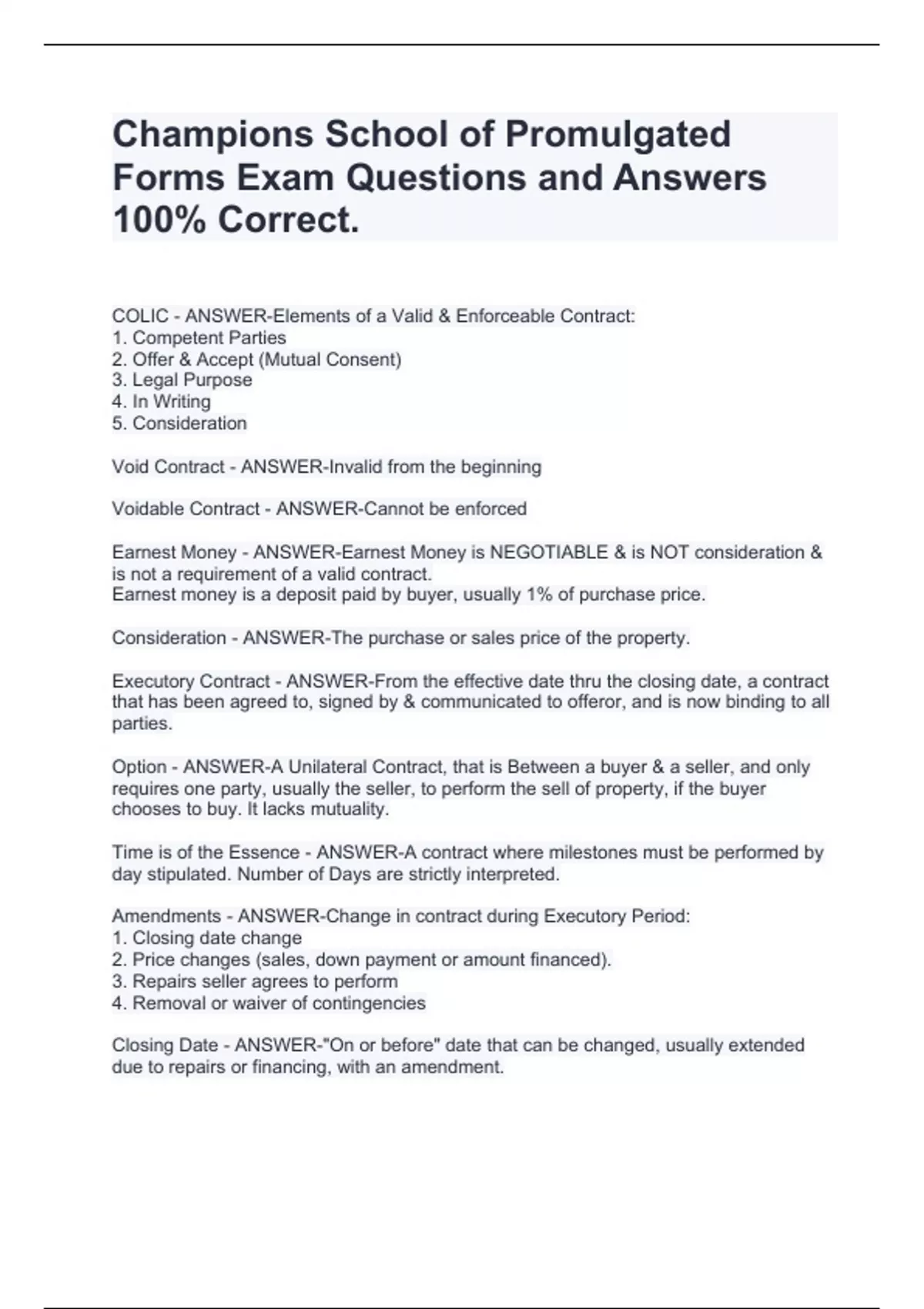 COLIC - ANSWER-Elements of a Valid & Enforceable Contract: 1. Competent Parties 2. Offer & Accept (Mutual Consent) 3. Legal Purpose 4. In Writing 5. Consideration Void Contract - ANSWER-Invalid from the beginning Voidable Contract - ANSWER-Cannot be enforced Earnest Money - ANSWER-Earnest Money is NEGOTIABLE & is NOT consideration & is not a requirement of a valid contract. Earnest money is a deposit paid by buyer, usually 1% of purchase price. Consideration - ANSWER-The purchase or sales price of the property. Executory Contract - ANSWER-From the effective date thru the closing date, a contract that has been agreed to, signed by & communicated to offeror, and is now binding to all parties. Option - ANSWER-A Unilateral Contract, that is Between a buyer & a seller, and only requires one party, usually the seller, to perform the sell of property, if the buyer chooses to buy. It lacks mutuality. Time is of the Essence - ANSWER-A contract where milestones must be performed by day stipulated. Number of Days are strictly interpreted. Amendments - ANSWER-Change in contract during Executory Period: 1. Closing date change 2. Price changes (sales, down payment or amount financed). 3. Repairs seller agrees to perform 4. Removal or waiver of contingencies Closing Date - ANSWER-"On or before" date that can be changed, usually extended due to repairs or financing, with an amendment. Change in Sales Price - ANSWER-Usually requires an amendment because the appraisal came in below sales price.