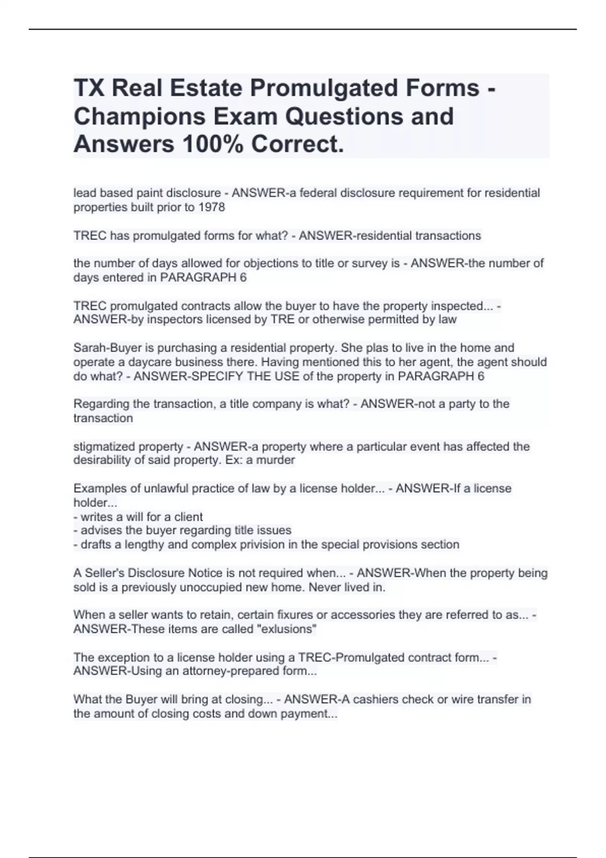lead based paint disclosure - ANSWER-a federal disclosure requirement for residential properties built prior to 1978 TREC has promulgated forms for what? - ANSWER-residential transactions the number of days allowed for objections to title or survey is - ANSWER-the number of days entered in PARAGRAPH 6 TREC promulgated contracts allow the buyer to have the property inspected... - ANSWER-by inspectors licensed by TRE or otherwise permitted by law Sarah-Buyer is purchasing a residential property. She plas to live in the home and operate a daycare business there. Having mentioned this to her agent, the agent should do what? - ANSWER-SPECIFY THE USE of the property in PARAGRAPH 6 Regarding the transaction, a title company is what? - ANSWER-not a party to the transaction stigmatized property - ANSWER-a property where a particular event has affected the desirability of said property. Ex: a murder Examples of unlawful practice of law by a license holder... - ANSWER-If a license holder... - writes a will for a client - advises the buyer regarding title issues - drafts a lengthy and complex privision in the special provisions section A Seller's Disclosure Notice is not required when... - ANSWER-When the property being sold is a previously unoccupied new home. Never lived in. When a seller wants to retain, certain fixures or accessories they are referred to as... - ANSWER-These items are called "exlusions" The exception to a license holder using a TREC-Promulgated contract form... - ANSWER-Using an attorney-prepared form... What the Buyer will bring at closing... - ANSWER-A cashiers check or wire transfer in the amount of closing costs and down payment... When a party fails to perform according to the terms of the contract... - ANSWER-The part is