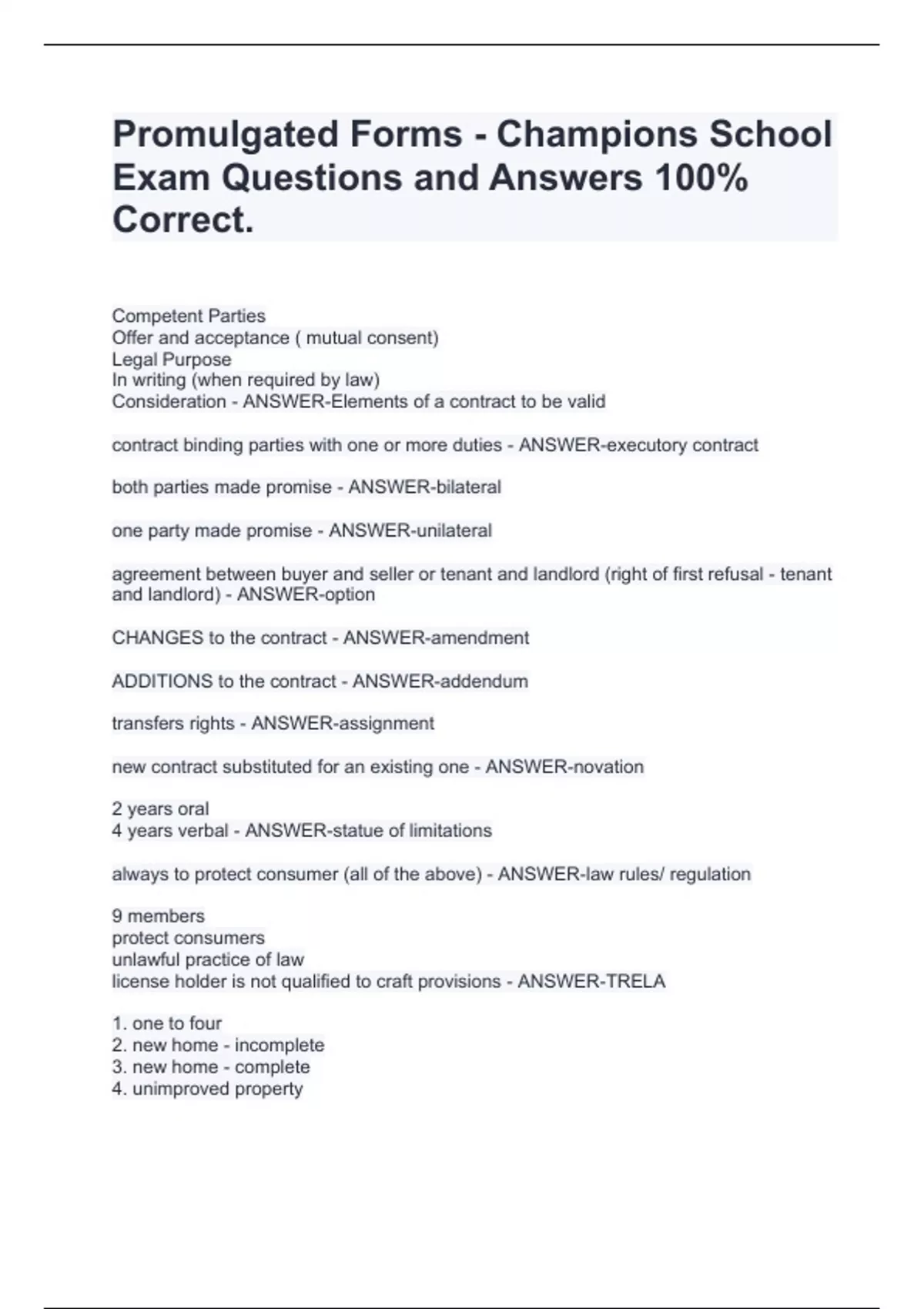 Competent Parties Offer and acceptance ( mutual consent) Legal Purpose In writing (when required by law) Consideration - ANSWER-Elements of a contract to be valid contract binding parties with one or more duties - ANSWER-executory contract both parties made promise - ANSWER-bilateral one party made promise - ANSWER-unilateral agreement between buyer and seller or tenant and landlord (right of first refusal - tenant and landlord) - ANSWER-option CHANGES to the contract - ANSWER-amendment ADDITIONS to the contract - ANSWER-addendum transfers rights - ANSWER-assignment new contract substituted for an existing one - ANSWER-novation 2 years oral 4 years verbal - ANSWER-statue of limitations always to protect consumer (all of the above) - ANSWER-law rules/ regulation 9 members protect consumers unlawful practice of law license holder is not qualified to craft provisions - ANSWER-TRELA 1. one to four 2. new home - incomplete 3. new home - complete 4. unimproved property 5. residential condominium contract 6. farm and ranch - ANSWER-TREC 6 promulgated forms NOT a promulgated form - ANSWER-LISTING AGREEMENT