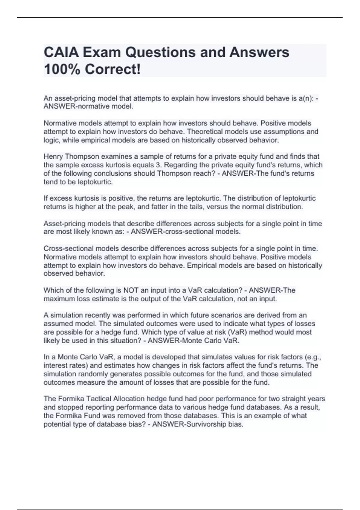 An asset-pricing model that attempts to explain how investors should behave is a(n): - ANSWER-normative model. Normative models attempt to explain how investors should behave. Positive models attempt to explain how investors do behave. Theoretical models use assumptions and logic, while empirical models are based on historically observed behavior. Henry Thompson examines a sample of returns for a private equity fund and finds that the sample excess kurtosis equals 3. Regarding the private equity fund's returns, which of the following conclusions should Thompson reach? - ANSWER-The fund's returns tend to be leptokurtic. If excess kurtosis is positive, the returns are leptokurtic. The distribution of leptokurtic returns is higher at the peak, and fatter in the tails, versus the normal distribution. Asset-pricing models that describe differences across subjects for a single point in time are most likely known as: - ANSWER-cross-sectional models. Cross-sectional models describe differences across subjects for a single point in time. Normative models attempt to explain how investors should behave. Positive models attempt to explain how investors do behave. Empirical models are based on historically observed behavior. Which of the following is NOT an input into a VaR calculation? - ANSWER-The maximum loss estimate is the output of the VaR calculation, not an input. A simulation recently was performed in which future scenarios are derived from an assumed model. The simulated outcomes were used to indicate what types of losses are possible for a hedge fund. Which type of value at risk (VaR) method would most likely be used in this situation? - ANSWER-Monte Carlo VaR. In a Monte Carlo VaR, a model is developed that simulates values for risk factors (e.g., interest rates) and estimates how changes in risk factors affect the fund's returns. The simulation randomly generates possible outcomes for the fund, and those simulated outcomes measure the amount of losses that are possible for the fund. The Formika Tactical Allocation hedge fund had poor performance for two straight years and stopped reporting performance data to various hedge fund databases. As a result, the Formika Fund was removed from those databases. This is an example of what potential type of database bias? - ANSWER-Survivorship bias. Survivorship bias refers to the fact that hedge funds that stop reporting performance da