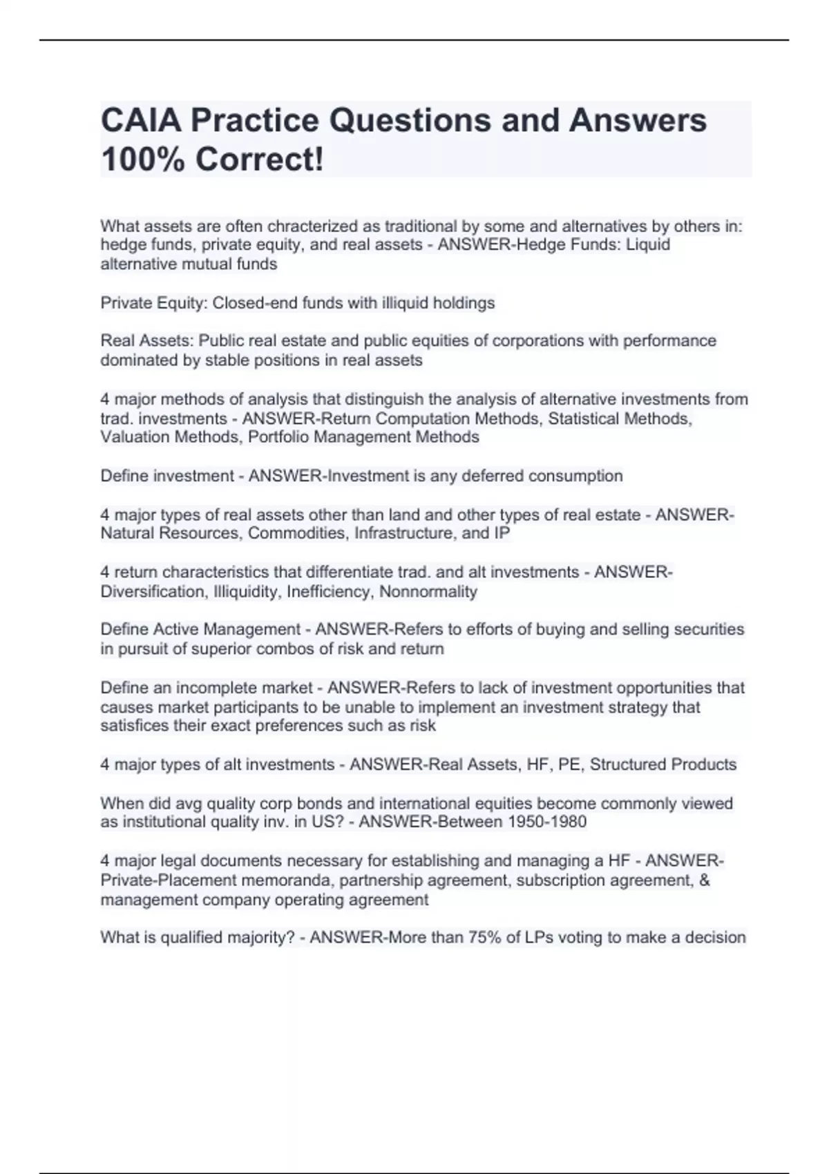 What assets are often chracterized as traditional by some and alternatives by others in: hedge funds, private equity, and real assets - ANSWER-Hedge Funds: Liquid alternative mutual funds Private Equity: Closed-end funds with illiquid holdings Real Assets: Public real estate and public equities of corporations with performance dominated by stable positions in real assets 4 major methods of analysis that distinguish the analysis of alternative investments from trad. investments - ANSWER-Return Computation Methods, Statistical Methods, Valuation Methods, Portfolio Management Methods Define investment - ANSWER-Investment is any deferred consumption 4 major types of real assets other than land and other types of real estate - ANSWER-Natural Resources, Commodities, Infrastructure, and IP 4 return characteristics that differentiate trad. and alt investments - ANSWER-Diversification, Illiquidity, Inefficiency, Nonnormality Define Active Management - ANSWER-Refers to efforts of buying and selling securities in pursuit of superior combos of risk and return Define an incomplete market - ANSWER-Refers to lack of investment opportunities that causes market participants to be unable to implement an investment strategy that satisfices their exact preferences such as risk 4 major types of alt investments - ANSWER-Real Assets, HF, PE, Structured Products When did avg quality corp bonds and international equities become commonly viewed as institutional quality inv. in US? - ANSWER-Between 4 major legal documents necessary for establishing and managing a HF - ANSWER-Private-Placement memoranda, partnership agreement, subscription agreement, & management company operating agreement What is qualified majority? - ANSWER-More than 75% of LPs voting to make a decision What is Systematic Risk? - ANSWER-Risk in the potential for economy wide losses attributable to failures or concerns over potential failures in markets 3 constraints against achieving alternative investment benefits through liquid products - ANSWER-Leverage, Regulatory constrains on concentration, Illiquidity constraints