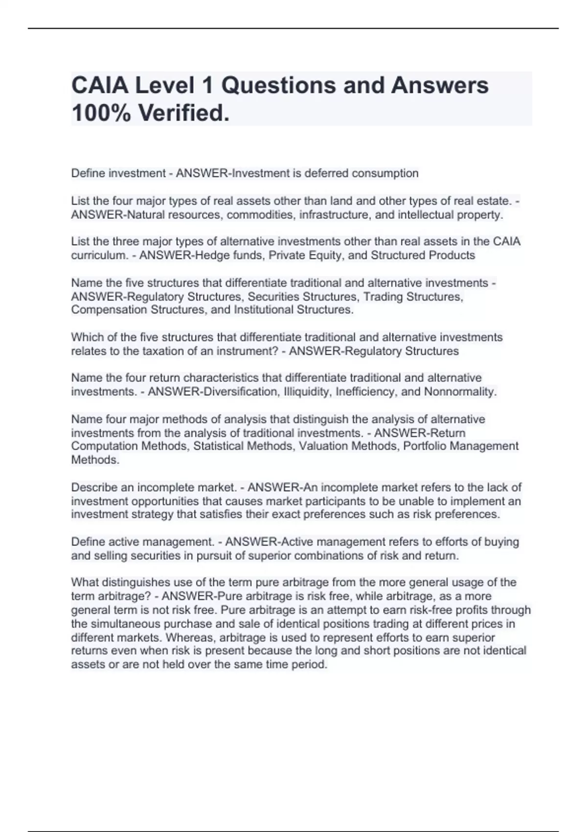 Define investment - ANSWER-Investment is deferred consumption List the four major types of real assets other than land and other types of real estate. - ANSWER-Natural resources, commodities, infrastructure, and intellectual property. List the three major types of alternative investments other than real assets in the CAIA curriculum. - ANSWER-Hedge funds, Private Equity, and Structured Products Name the five structures that differentiate traditional and alternative investments - ANSWER-Regulatory Structures, Securities Structures, Trading Structures, Compensation Structures, and Institutional Structures. Which of the five structures that differentiate traditional and alternative investments relates to the taxation of an instrument? - ANSWER-Regulatory Structures Name the four return characteristics that differentiate traditional and alternative investments. - ANSWER-Diversification, Illiquidity, Inefficiency, and Nonnormality. Name four major methods of analysis that distinguish the analysis of alternative investments from the analysis of traditional investments. - ANSWER-Return Computation Methods, Statistical Methods, Valuation Methods, Portfolio Management Methods.