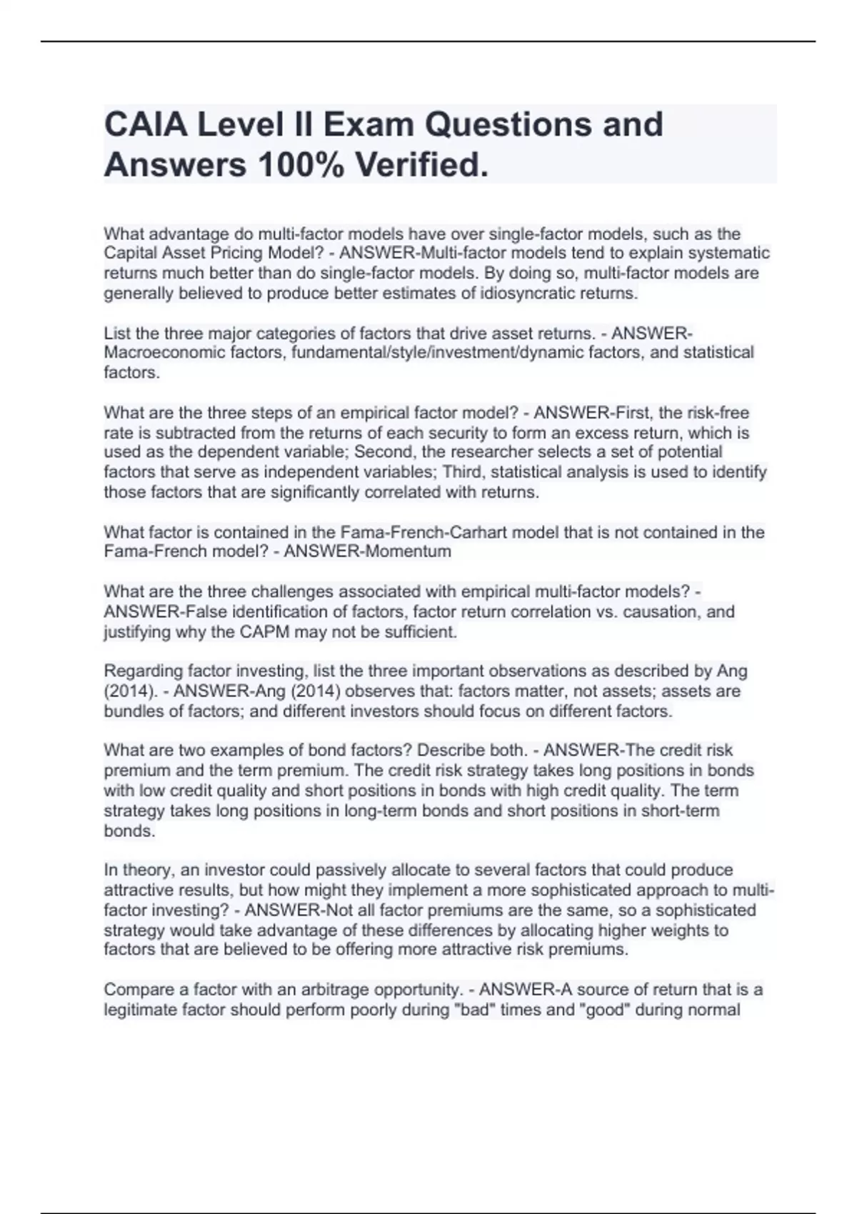 What advantage do multi-factor models have over single-factor models, such as the Capital Asset Pricing Model? - ANSWER-Multi-factor models tend to explain systematic returns much better than do single-factor models. By doing so, multi-factor models are generally believed to produce better estimates of idiosyncratic returns. List the three major categories of factors that drive asset returns. - ANSWER-Macroeconomic factors, fundamental/style/investment/dynamic factors, and statistical factors. What are the three steps of an empirical factor model? - ANSWER-First, the risk-free rate is subtracted from the returns of each security to form an excess return, which is used as the dependent variable; Second, the researcher selects a set of potential factors that serve as independent variables; Third, statistical analysis is used to identify those factors that are significantly correlated with returns. What factor is contained in the Fama-French-Carhart model that is not contained in the Fama-French model? - ANSWER-Momentum What are the three challenges associated with empirical multi-factor models? - ANSWER-False identification of factors, factor return correlation vs. causation, and justifying why the CAPM may not be sufficient. Regarding factor investing, list the three important observations as described by Ang (2014). - ANSWER-Ang (2014) observes that: factors matter, not assets; assets are bundles of factors; and different investors should focus on different factors. What are two examples of bond factors? Describe both. - ANSWER-The credit risk premium and the term premium. The credit risk strategy takes long positions in bonds with low credit quality and short positions in bonds with high credit quality. The term strategy takes long positions in long-term bonds and short positions in short-term bonds. In theory, an investor could passively allocate to several factors that could produce attractive results, but how might they implement a more sophisticated approach to multi-factor investing? - ANSWER-Not all factor premiums are the same, so a sophisticated strategy would take advantage of these differences by allocating higher weights to factors that are believed to be offering more attractive risk premiums. Compare a factor with an arbitrage opportunity. - ANSWER-A source of return that is a legitimate factor should perform poorly during "bad" times and "good" during normal times. If a source of return performs well in both "bad" and "good" times, it's an arbitrage opportunity. Describe the four practical implications of an adaptive view on markets. - ANSWER-1)tradeoff between risk and return is not stable over time and risk premiums can be predicted based on technical and fundamental variables 2)Market efficiency is a relative concept instead of an absolute one; market displays varying degrees of efficiency depending on the point in time and the participant. 3)It is necessary to use adaptable investment approaches to handle changes in the ma