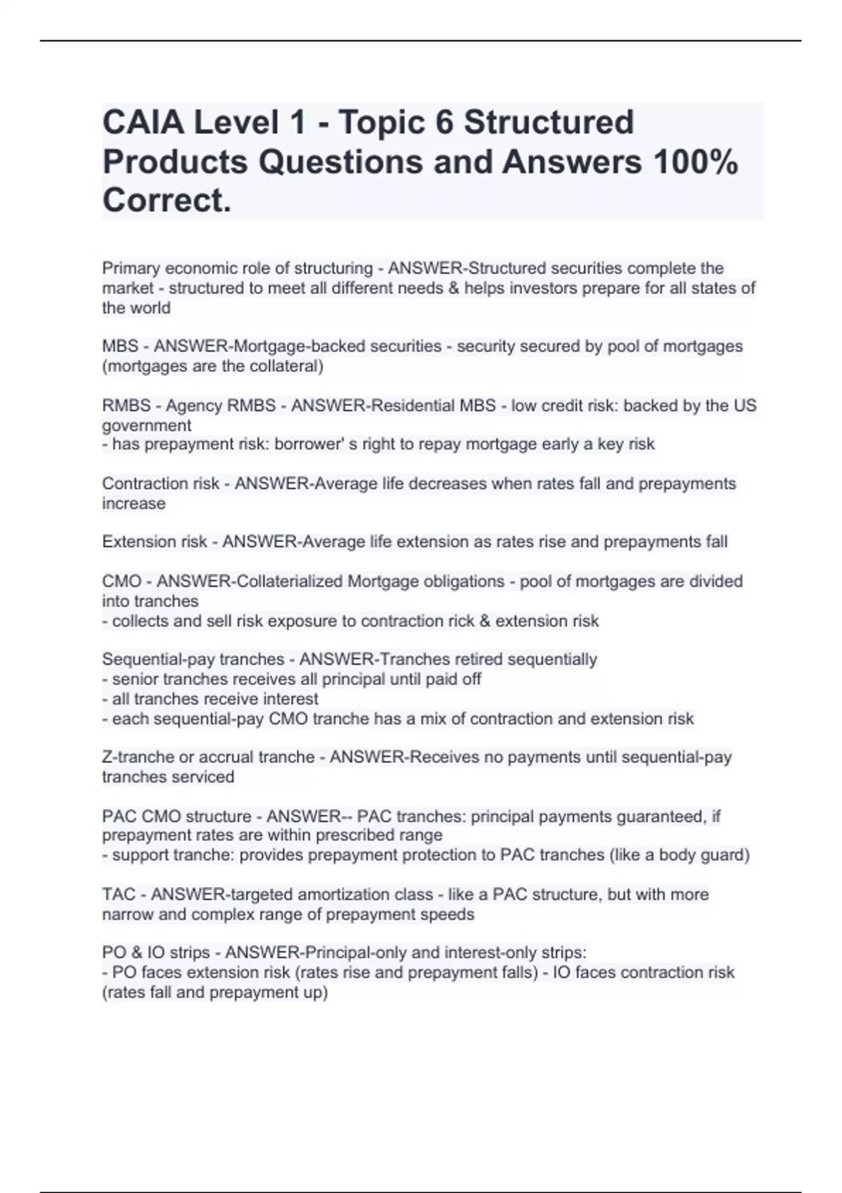 Primary economic role of structuring - ANSWER-Structured securities complete the market - structured to meet all different needs & helps investors prepare for all states of the world MBS - ANSWER-Mortgage-backed securities - security secured by pool of mortgages (mortgages are the collateral) RMBS - Agency RMBS - ANSWER-Residential MBS - low credit risk: backed by the US government - has prepayment risk: borrower' s right to repay mortgage early a key risk Contraction risk - ANSWER-Average life decreases when rates fall and prepayments increase Extension risk - ANSWER-Average life extension as rates rise and prepayments fall CMO - ANSWER-Collaterialized Mortgage obligations - pool of mortgages are divided into tranches - collects and sell risk exposure to contraction rick & extension risk Sequential-pay tranches - ANSWER-Tranches retired sequentially - senior tranches receives all principal until paid off - all tranches receive interest - each sequential-pay CMO tranche has a mix of contraction and extension risk Z-tranche or accrual tranche - ANSWER-Receives no payments until sequential-pay tranches serviced PAC CMO structure - ANSWER-- PAC tranches: principal payments guaranteed, if prepayment rates are within prescribed range - support tranche: provides prepayment protection to PAC tranches (like a body guard) TAC - ANSWER-targeted amortization class - like a PAC structure, but with more narrow and complex range of prepayment speeds PO & IO strips - ANSWER-Principal-only and interest-only strips: - PO faces extension risk (rates rise and prepayment falls) - IO faces contraction risk (rates fall and prepayment up) Floating / inverse floater rate tranches - ANSWER-Linked to index such as LIBOR Structural Credit Risk Model - ANSWER-Incorporate characteristics of the borrower: 1) str