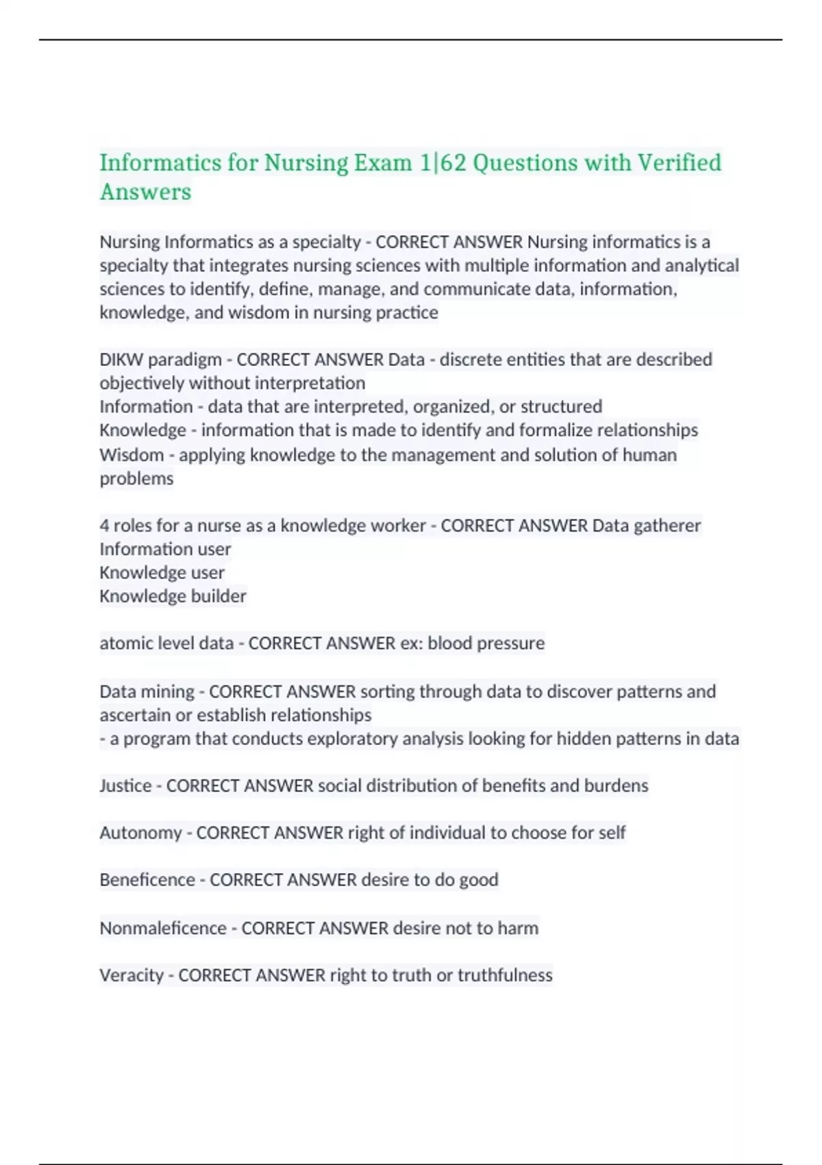 Informatics for Nursing Exam 1|62 Questions with Verified Answers Nursing Informatics as a specialty - CORRECT ANSWER Nursing informatics is a specialty that integrates nursing sciences with multiple information and analytical sciences to identify, define, manage, and communicate data, information, knowledge, and wisdom in nursing practice DIKW paradigm - CORRECT ANSWER Data - discrete entities that are described objectively without interpretation Information - data that are interpreted, organized, or structured Knowledge - information that is made to identify and formalize relationships Wisdom - applying knowledge to the management and solution of human problems 4 roles for a nurse as a knowledge worker - CORRECT ANSWER Data gatherer Information user Knowledge user Knowledge builder atomic level data - CORRECT ANSWER ex: blood pressure Data mining - CORRECT ANSWER sorting through data to discover patterns and ascertain or establish relationships - a program that conducts exploratory analysis looking for hidden patterns in data Justice - CORRECT ANSWER social distribution of benefits and burdens Autonomy - CORRECT ANSWER right of individual to choose for self Beneficence - CORRECT ANSWER desire to do good Nonmaleficence - CORRECT ANSWER desire not to harm Veracity - CORRECT ANSWER right to truth or truthfulness Fidelity - CORRECT ANSWER faithfulness to what has been promised Freedom - CORRECT ANSWER ability and right to make choices HITECH - CORRECT ANSWER purpose is to improve healthcare quality, reducing health disparities, and ensuring the security of patient health information 4 tasks of human information processing - CORRECT ANSWER - Data gathering - information use - creative application of knowledge to clinical practice - generation of new knowledge HIT - CORRECT ANSWER health information technologies POC - CORRECT ANSWER point of care Define Nursing Informatics - CORRECT ANSWER A specialty that integrates nursing science, computer science, and information science to manage and communicate data, information, knowledge, and wisdom in nursing practice. What are the 3 sciences involved in Nursing Informatics? - CORRECT ANSWER computer science information science nursing science Information theory - CORRECT ANSWER Processing data to produce information and, in combination with knowledge and wisdom, using information to provide care systems theory - CORRECT ANSWER interaction with a system will create something bigger/better than just the sum of the parts socio-technical theory - CORRECT ANSWER study how people work and what they do to create improved interaction between technology and an organization's culture chaos theory - CORRECT ANSWER focus on design improvements that account for the conditions that exist in a organization EMR - CORRECT ANSWER -electronic medical record -narrower view of a patient's medical history -one facilities information EHR - CORRECT ANSWER -electronic health record -more comprehensive information regarding the patient's overall health -combination of all the documentation from multiple providers What is a PHR? Who is responsible for its maintenance? - CORRECT ANSWER -personal health record -allows users to maintain/manage their own health information with authorized providers -the patient is responsible to make sure everything is up to date 3 benefits of a PHR - CORRECT ANSWER -PHR's will further collaborative care, partnership between the patient and their healthcare providers, gets the patient involved -The ability to manage one's disease treatment more effectively -Avoiding medications that can't work together -Giving a patient authority/accountability 3 limitations of a PHR - CORRECT ANSWER -Concerns about privacy and security -Accuracy, a patient can add anything they think is wrong -Knowledge/denial, hiding information from your family, job, insurance what is a smart card? - CORRECT ANSWER It looks like a plastic credit card and like a credit card, has embedded information that a smart card reader can read, the chip requires the appropriate computer system and access code to read and write, encrypts all data on the card purpose of 'meaningful use' - CORRECT ANSWER -The use of information from EHR's to make improvements in the delivery of healthcare (ARRA- American Recovery and Reinvestment Act) -Creating new jobs and saving existing ones, improving economic activity while investing in long-term growth core objective: stage 1 - CORRECT ANSWER -Verify that the EHR could capture and share data -(i.e. Vital signs, med lists) core objective: stage 2 - CORRECT ANSWER -Users utilize the advanced clinical processes to analyze data and make care improvements -(i.e. medication reconciliation, recording patient notes electronically) Describe how a clinical information system (EMR or EHR) contributes to patient safety. - CORRECT ANSWER -The clinical information system contributes to patient safety because all data recorded on the patient will be shared with all healthcare providers (care facilities, clinicians, laboratories, pharmacies) which will assure if a patient is on a certain medication that does not correlate with another they are aware. -Some individuals may not remember important information such as when they last received a certain immunization, when they had a certain surgery, and in life threatening situations this is dangerous, with EMR/EHR's the hospitals can pull all the records on that patient from any hospital they checked in at beginning nurses - CORRECT ANSWER Possess basic information management and computer technology skills experienced nurses - CORRECT ANSWER Highly skilled in using information management and computer technology to support their major area of practice, looking at trends nursing informatics specialists - CORRECT ANSWER Meet the information needs of practicing nurses by integrating and applying information, computer, and nursing sciences informatics innovators - CORRECT ANSWER Will conduct informatics research and generate i
