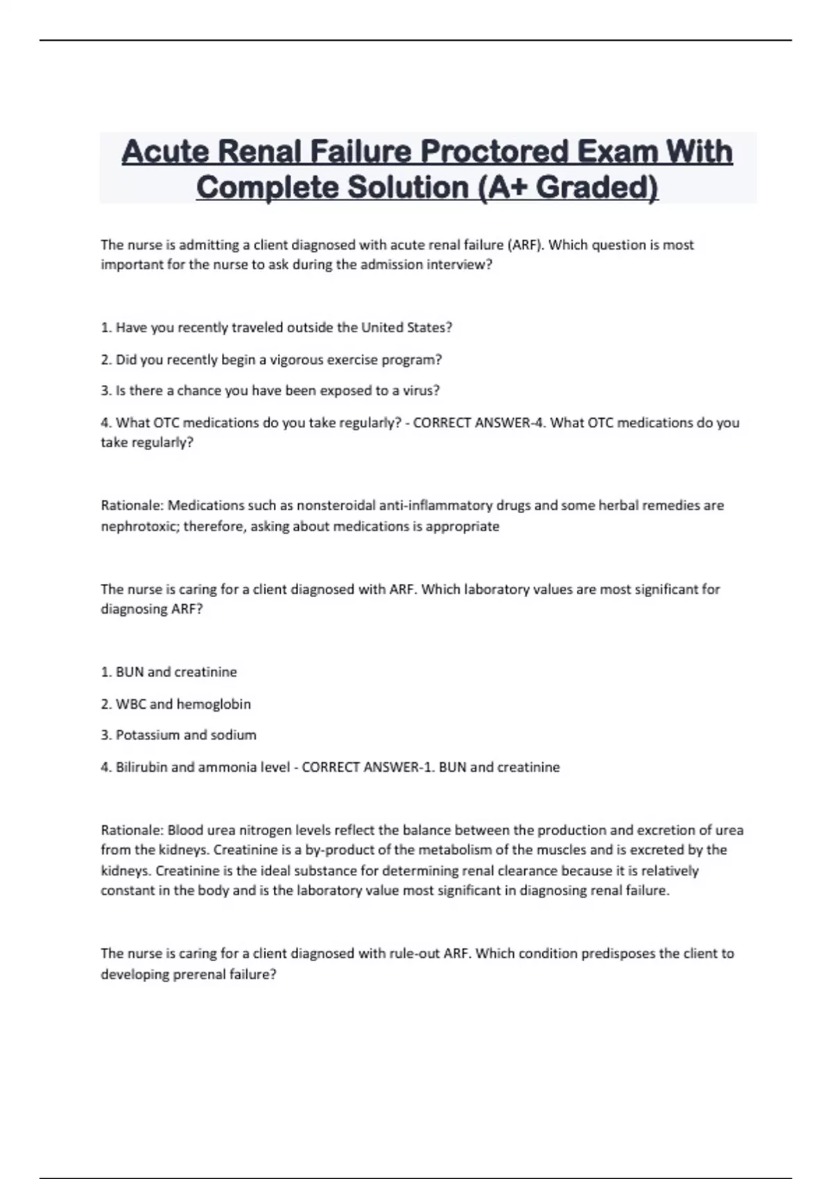 Acute Renal Failure Proctored Exam With Complete Solution (A+ Graded) The nurse is admitting a client diagnosed with acute renal failure (ARF). Which question is most important for the nurse to ask during the admission interview? 1. Have you recently traveled outside the United States? 2. Did you recently begin a vigorous exercise program? 3. Is there a chance you have been exposed to a virus? 4. What OTC medications do you take regularly? - CORRECT ANSWER-4. What OTC medications do you take regularly?