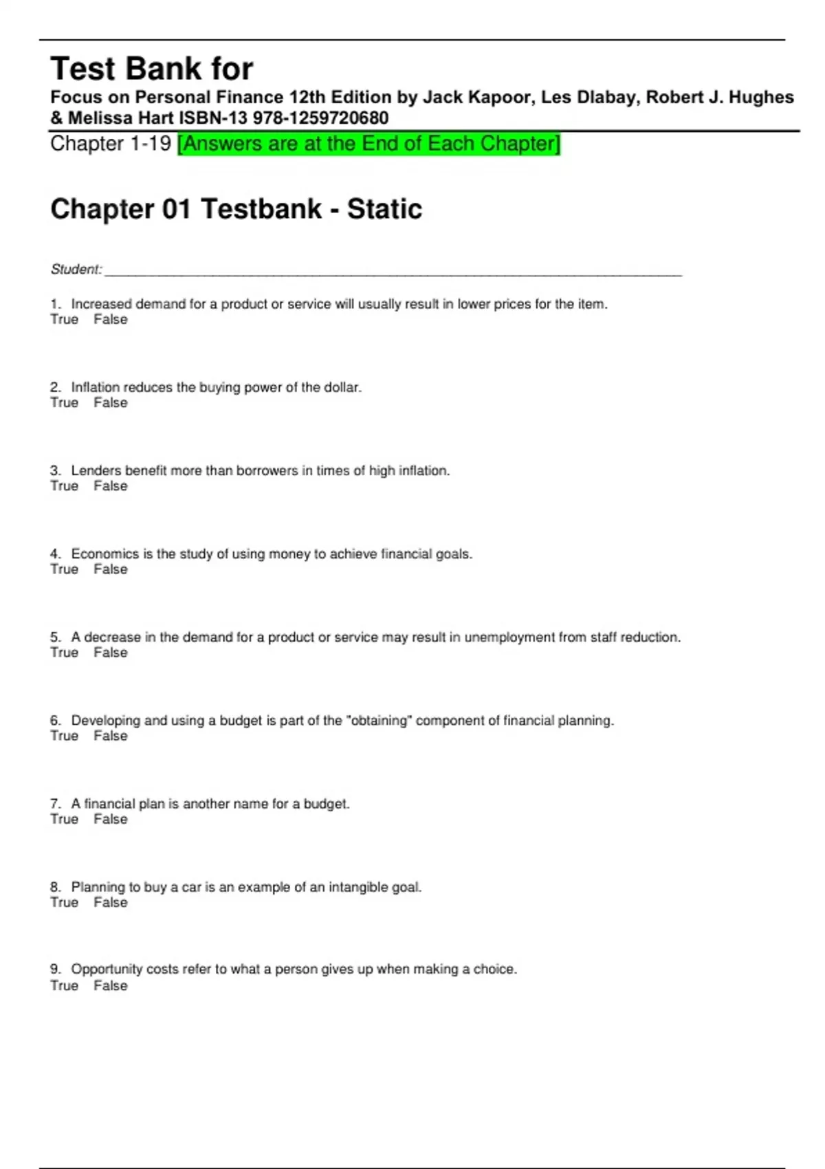 Test Bank for Focus on Personal Finance 12th Edition by Jack Kapoor, Les Dlabay, Robert J. Hughes & Melissa Hart. Part 1: Planning Your Personal Finances Chapter 1: Personal Finance Basics and the Time Value of Money Appendix: The Time Value of Money? Chapter 2: Financial Aspects of Career Planning? Appendix: Résumés, Cover Letters, and Interviews? Chapter 3: Money Management Strategy: Financial Statements and Budgeting? Appendix: Money Management Information Sources and Advisors? Chapter 4: Planning Your Tax Strategy? Part 2: Managing Your Personal Finances Chapter 5: Financial Services: Savings Plans and Payment Methods Chapter 6: Introduction to Consumer Credit Chapter 7: Choosing a Source of Credit: The Costs of Credit Alternatives Part 3: Making Your Purchasing Decisions Chapter 8: Consumer Purchasing Strategies and Legal Protection Appendix: Consumer Protection Agencies and Organizations Chapter 9: The Housing Decision: Factors and Finances Part 4: Insuring Your Resources Chapter 10: Property and Motor Vehicle Insurance? Chapter 11: Health, Disability, and Long-Term Care Insurance? Chapter 12: Life Insurance? Part 5: Investing Your Financial Resources Chapter 13: Investing Fundamentals? Chapter 14: Investing in Stocks? Chapter 15: Investing in Bonds? Chapter 16: Investing in Mutual Funds? Chapter 17: Investing in Real Estate and Other Investment Alternatives Part 6: Controlling Your Financial Future Chapter 18: Starting Early: Retirement Planning? Chapter19: Estate Planning