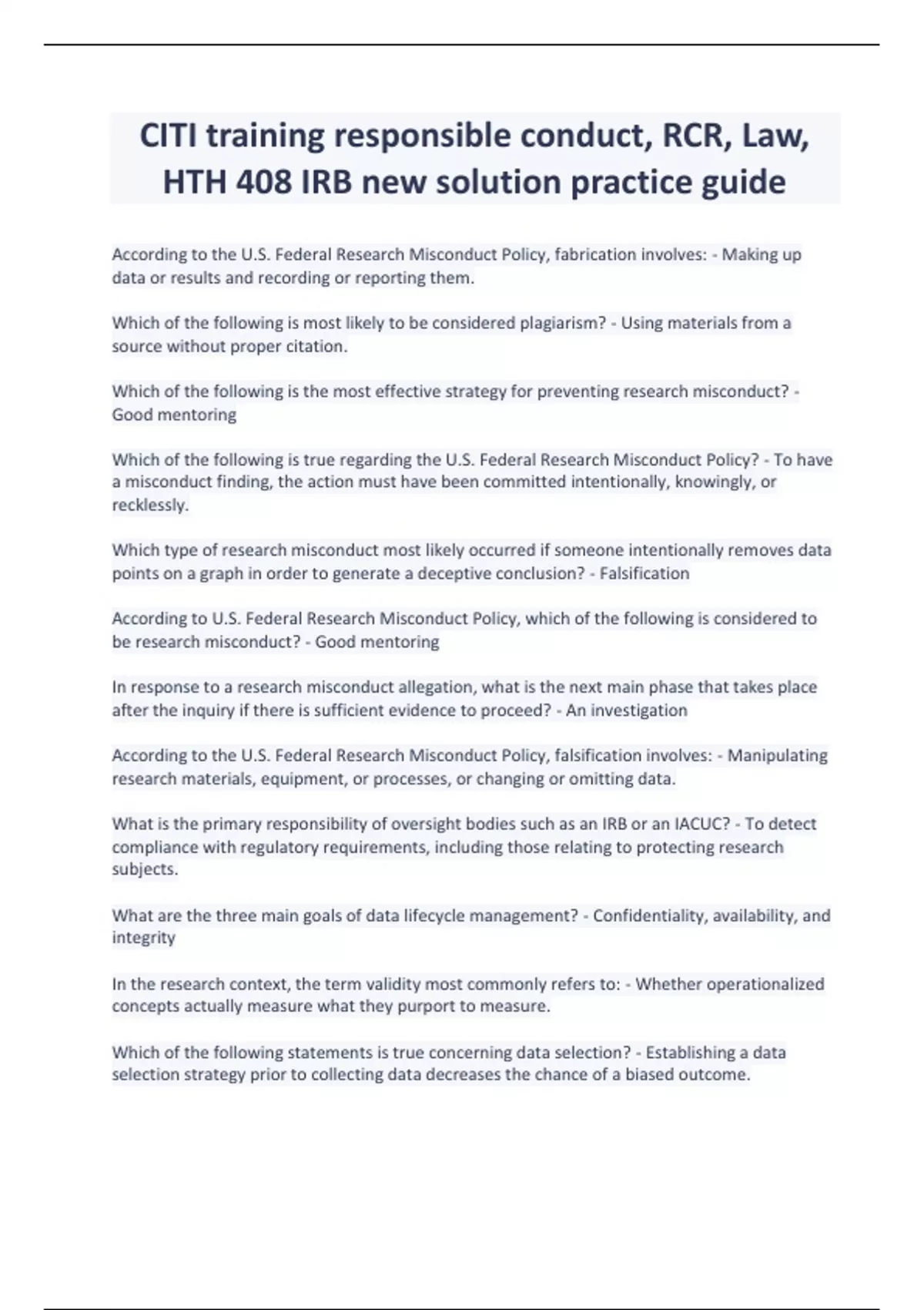 CITI training responsible conduct, RCR, Law, HTH 408 IRB new solution practice guide.