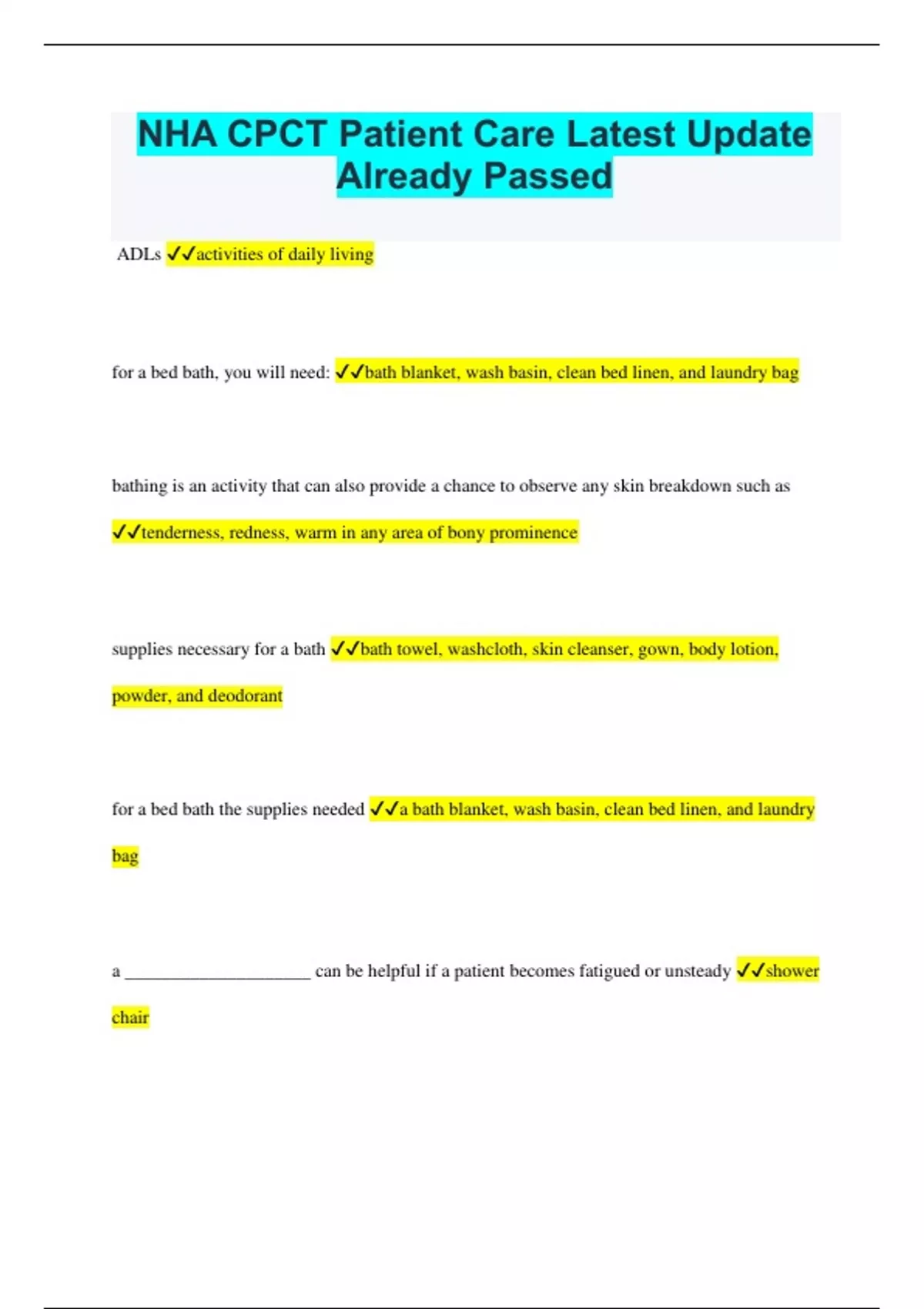 NHA CPCT Patient Care Latest Update Already Passed ADLs activities of daily living for a bed bath, you will need: bath blanket, wash basin, clean bed linen, and laundry bag bathing is an activity that can also provide a chance to observe any skin breakdown such as tenderness, redness, warm in any area of bony prominence supplies necessary for a bath bath towel, washcloth, skin cleanser, gown, body lotion, powder, and deodorant for a bed bath the supplies needed a bath blanket, wash basin, clean bed linen, and laundry bag a ____________________ can be helpful if a patient becomes fatigued or unsteady shower chair when bathing patients a complete bed bath is not done everyday how does a patient check the water temperature? use back of hand the bath water should be at for a warm temperature 37* to 46* C (98.6* to 115* F) most routine baths are at what temperature? 40.5* to 43.3* C (105* to 110* F) for privacy for a bath keep the patient's room door closes, pull curtain in a shared space, and keep the patient's body covered with a bath blanket a ______________ should be in close reach, especially if patient is alone in the shower call light during bed baths, keep the bed rail on the _____________ side to ensure the patient does not roll off the bed. opposite Ensure ____ sites and ___________________ are protected from moisture, which could lead to infection. IV; surgical incisions wash the patient from cleanest to dirtiest areas to prevent contamination when washing patient use long firm strokes to stimulate circulation do not rub the skin vigorously with the towel when drying patient, instead pat dry a partial bath consists of cleansing the patient's face, neck, hands, back, armpits, buttocks, and perineal area perineal genital and anal areas for perineal care was from anterior to posterior (front to back) never raise the drainage bag higher than the patient's bladder lifting the patients drainage bag higher than the patient's bladder can cause contaminated urine to drain back into the bladder, leading to infection when cleaning a perineal area with a catheter, cleanse