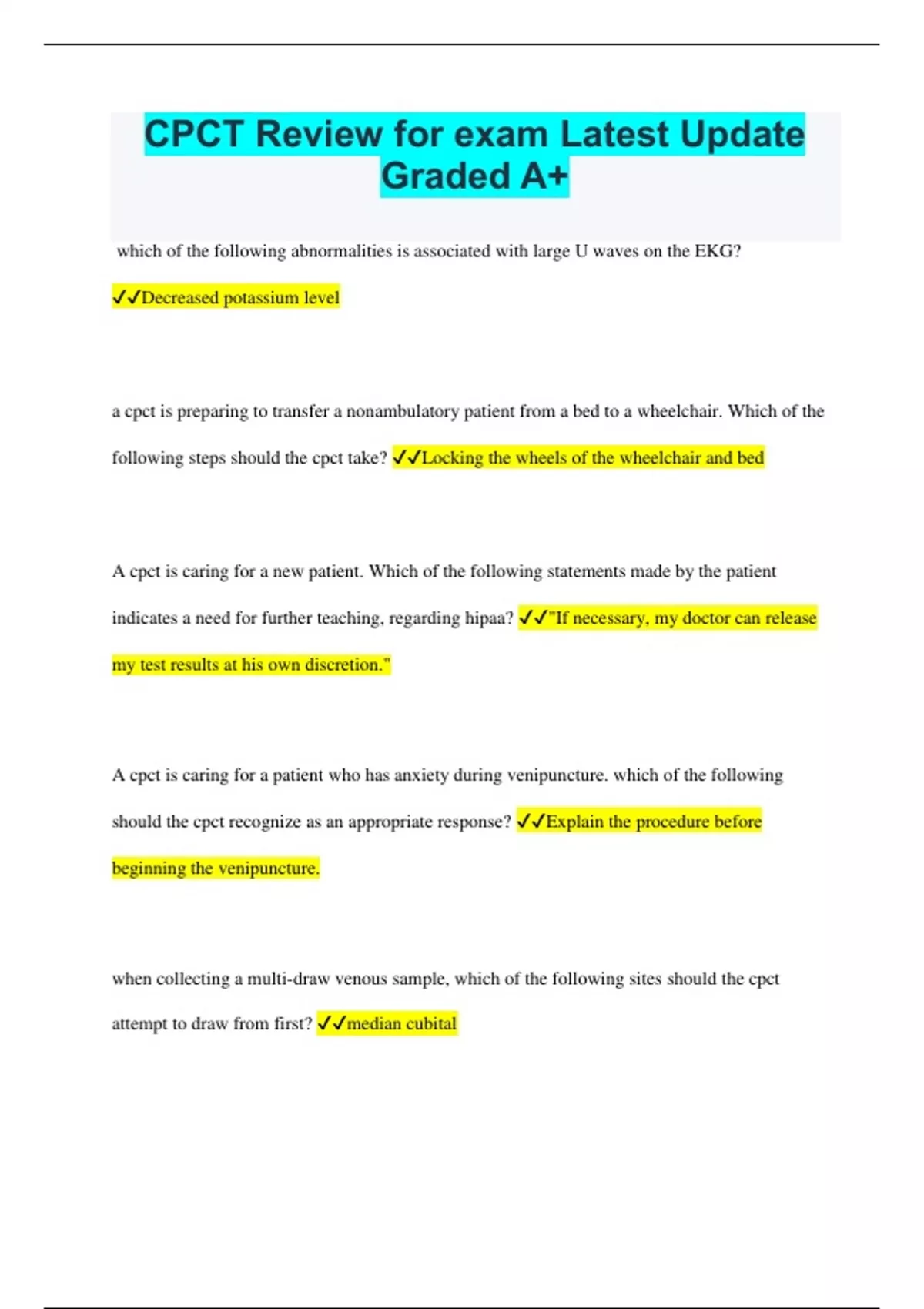 CPCT Review for exam Latest Update Graded A+ which of the following abnormalities is associated with large U waves on the EKG? Decreased potassium level a cpct is preparing to transfer a nonambulatory patient from a bed to a wheelchair. Which of the following steps should the cpct take? Locking the wheels of the wheelchair and bed A cpct is caring for a new patient. Which of the following statements made by the patient indicates a need for further teaching, regarding hipaa? "If necessary, my doctor can release my test results at his own discretion." A cpct is caring for a patient who has anxiety during venipuncture. which of the following should the cpct recognize as an appropriate response? Explain the procedure before beginning the venipuncture. when collecting a multi-draw venous sample, which of the following sites should the cpct attempt to draw from first? median cubital A CPCT is collecting a stool specimen from a newly admitted patient. The CPCT should recognize that which of the following findings could be a sign of an upper gastrointestinal disorder? Black, tarry stool The choice to perform a capillary puncture is best determined by which of the following fractures? test ordered During a stress test, a CPCT notices the patient appears to be hyperventilating. Which of the following is an appropriate course of action for the technician Check the patient's respiratory rate. A patient represents alert and oriented, but a CPCT finds that all the waveforms are negative in Lead I. The technician should check the cable connection for which of the following Right arm and left arm To prevent any needle sticks during venipuncture, OSHA guidelines require Disposing of needles in a sharps container A CPCT is in the cafeteria during lunch. A visitor appears to be in respiratory distress. The visitors lips and tongue are swollen. Which of the following actions should the CPCT take? Ask the person if she has any allergies A CPCT observes a hematoma developing at the site of a venous blood draw. The CPCT should Release the tourniquet and stop the draw The CPCT needs to draw a GTT on a patient and notices an empty breakfast plate on the beadside table. Which of the following actions should the CPCT take? Ask the patient if he has had anything to eat or drink While working with the automated Laboratory information system, correct input of data is most critical because incorrect data may Be reported to the health care provider Which of the following procedural steps for a finger stick should the CPCT do first? Confirm the correct identity of the patient A CPCT informs the nurse concerning swelling at