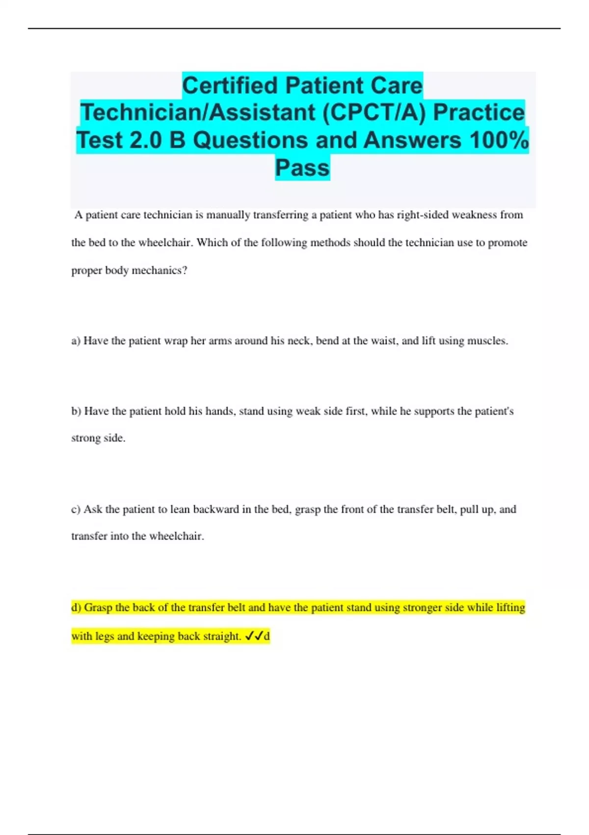 Certified Patient Care Technician/Assistant (CPCT/A) Practice Test 2.0 B Questions and Answers 100% Pass A patient care technician is manually transferring a patient who has right-sided weakness from the bed to the wheelchair. Which of the following methods should the technician use to promote proper body mechanics? a) Have the patient wrap her arms around his neck, bend at the waist, and lift using muscles. b) Have the patient hold his hands, stand using weak side first, while he supports the patient's strong side. c) Ask the patient to lean backward in the bed, grasp the front of the transfer belt, pull up, and transfer into the wheelchair. d) Grasp the back of the transfer belt and have the patient stand using stronger side while lifting with legs and keeping back straight. d A patient care technician is caring for several adult patients. Which of the following findings should the technician report to the nurse first? a) Blood pressure 139/88 mm Hg b) Apical pulse 108/min c) Respiratory rate 22/min d) Temperature 38.5 degrees C (100.5 degrees F) d A patient care technician is caring for a patient who suddenly becomes unresponsive. Which of the following actions should the technician take first? a) Check the movement of the patient's chest for 10 seconds. b) Tap the patient's shoulders and ask, "Are you okay?" c) Start chest compressions after placing the patient flat. d) Notify the emergency response team b A patient care technician is using a new disinfectant to clean a soiled mattress. The technician notes a skull and crossbones symbol on the label of the disinfectant. Which hazards does this symbol indicate? a) Explosive b) Flammable c) Skin irritant d) Acute toxicity d A patient care technician is preparing to transport a patient via a stretcher. Which of the following actions should the technician take