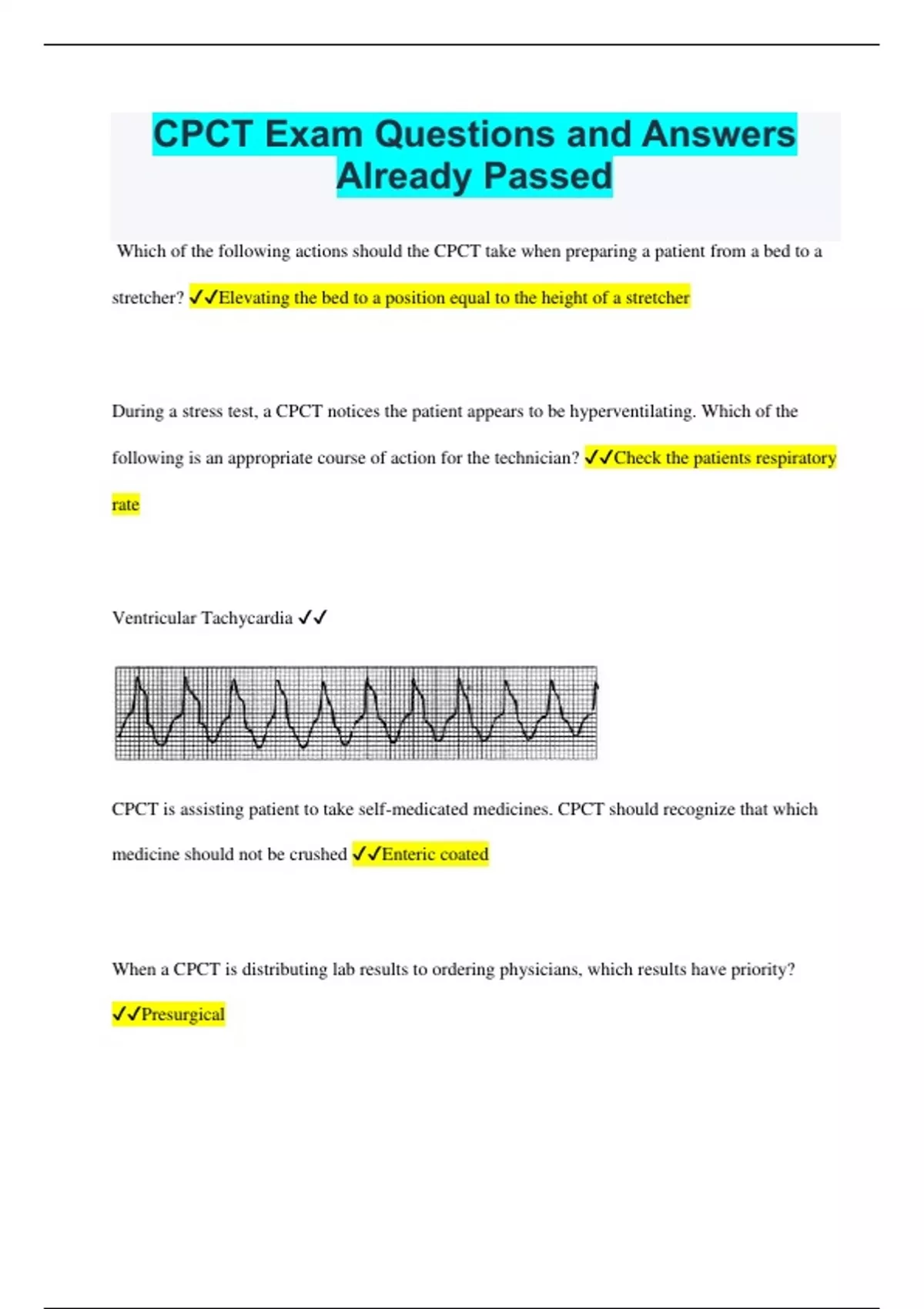 CPCT Exam Questions and Answers Already Passed Which of the following actions should the CPCT take when preparing a patient from a bed to a stretcher? Elevating the bed to a position equal to the height of a stretcher During a stress test, a CPCT notices the patient appears to be hyperventilating. Which of the following is an appropriate course of action for the technician? Check the patients respiratory rate Ventricular Tachycardia CPCT is assisting patient to take self-medicated medicines. CPCT should recognize that which medicine should not be crushed Enteric coated When a CPCT is distributing lab results to ordering physicians, which results have priority? Presurgical CPCT is changing a patients bedding and is accidentally stuck with a needle. Which actions should CPCT take first? Milk affected site CPCT should recognize that a chain of custody is used for which of the following reasons: To guarantee the identification and integrity of samples Industry standard states that needle insertion in the antecubital area should be at: 15-30 degree angle Which of the following tubes should be collected 1st for dermal samples? Lavender top When should the code on glucose curettes be compared to the code on the glucometer? When a patient is tested CPCT makes a mistake while measuring a patients blood pressure. Which of the following actions should the CPCT take? Release all of the air from cuff before retesting CPCT is assisting with the care of a patient who is receiving a blood transfusion. Which of the following vital signs should the CPCT report 1st? Increase in temperature CPCT is caring for a new patient. Which of the following statements made by the patient indicates a need for further teaching, regarding HIPPA? "If necessary, my doctor can release my test results at his own discretion." CPCT is caring for a patient who is to receive continuous tube feedings. The CPCT should place the patient into which position? Semi-Fowlers CPCT should recognize that which of the following statements regarding skin preparation for blood cultures is correct? I will cleanse the area with chlorexide gluconate CPCT is monitoring a patient who has severe hypertension. Which of the findings should the CPCT report to the nurse? Patients lower limbs show pitting edema CPCT informs nurse concerning swelling at the IV site. CPCT should recognize which of the following is most likely cause of this finding Catheter infiltration CPCT is drawing blood from a patient and observes red spots. Which is an appropriate action for CPCT to take? Apply pressure to site Which of the following is a consequence of mislabeling a blood bank specimen? Transfusion reaction CPCT is taking a patients oxygen reading. CPCT can't get the reading to appear on the monitor. Which is the cause? Blood pressure 84/62 with cold hands and fingers CPCT is caring for a patient who is nonambulatory. Before manually lifting patient, which of the following factors should the CPCT consider first? Patients ability to assist Patient presents alert and oriented, but CPCT finds that all waveforms are negative in lead 1. The tech should check the cable connections for which of the following limbs? Right arm and left arm CPCT is caring for a patient with congestive heart failure. Which of the following should be reported to the nurse immediately? Swelling in legs and feet The choice to perform a capillary puncture is
