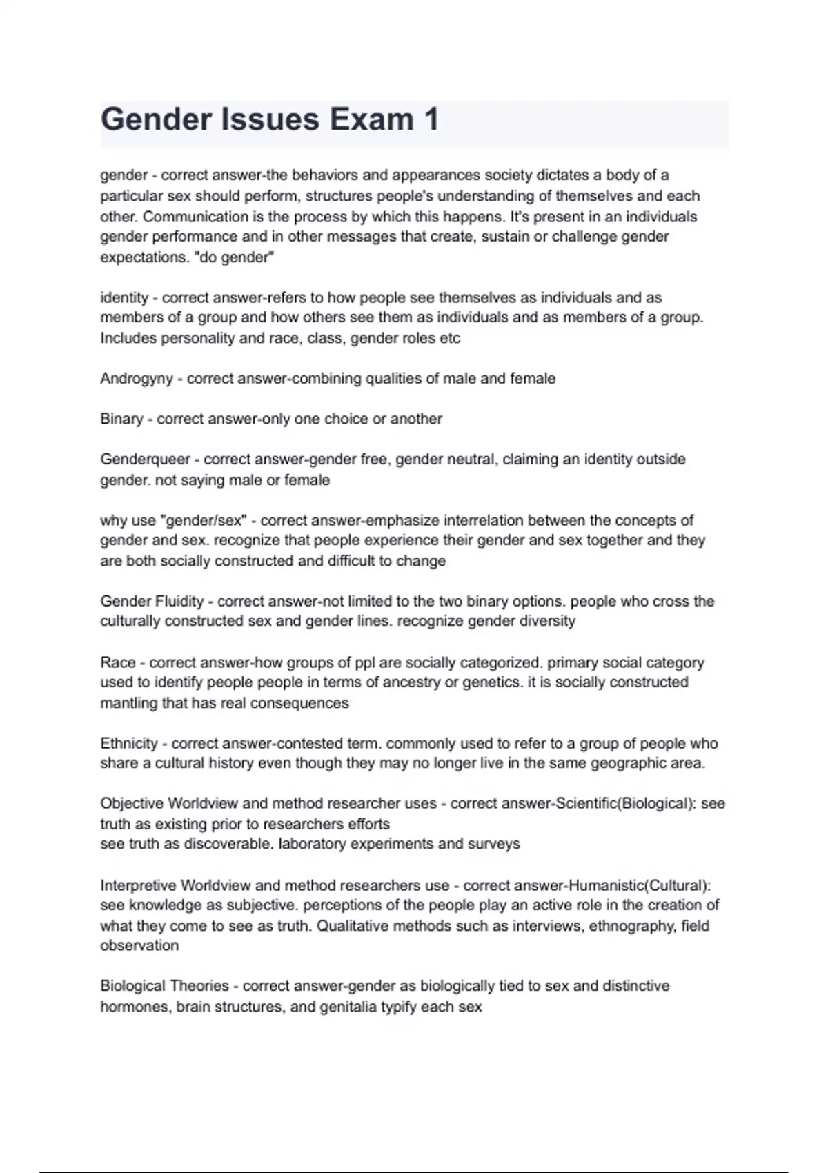 Gender Issues Exam 1 Questions & answers